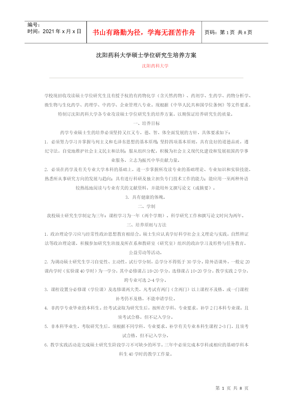编号:时间:2021年x月x日书山有路勤为径,学海无涯苦作舟页码:第PAGE8页共NUMPAGES8页第PAGE\*MERGEFORMAT8页共NUMPAGES\*MERGEFORMAT8页沈阳药科大学硕士学位研究生培养方案沈阳药科大学学校现招收攻读硕士学位研究生且有授予权的有药物化学(含天然药物)、药剂学、生药学、药物分析学、微生物与生化药学、药理学、中药学、企业管理八专业。现根据《中华人民共和国学位条例》等文件要求,特制订沈阳药科大学各专业攻读硕士学位研究生的培养方案,以期保证