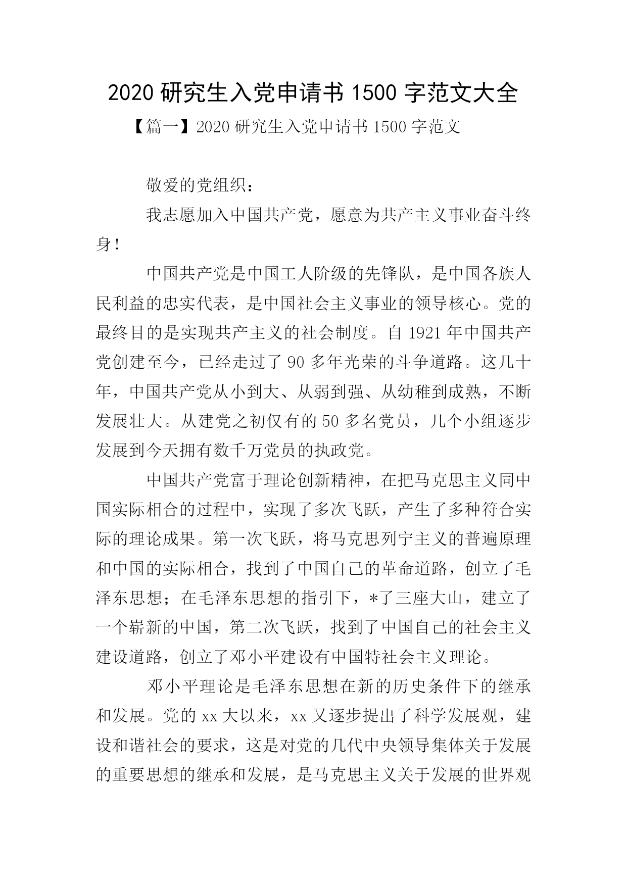 2020研究生入党申请书1500字范文大全【篇一】2020研究生入党申请书1500字范文敬爱的党组织:我志愿加入中国共产党,愿意为共产主义事业奋斗终身!中国共产党是中国工人阶级的先锋队,是中国各族人民利益的忠实代表,是中国社会主义事业的领导核心。党的最终目的是实现共产主义的社会制度。自1921年中国共产党创建至今,已经走过了90多年光荣的斗争道路。这几十年,中国共产党从小到大、从弱到强、从幼稚到成熟,不断发展壮大。从建党之初仅有的50多名党员,几个小组逐步发展到今天拥有数千万党员的执政党。中国共产党富于理