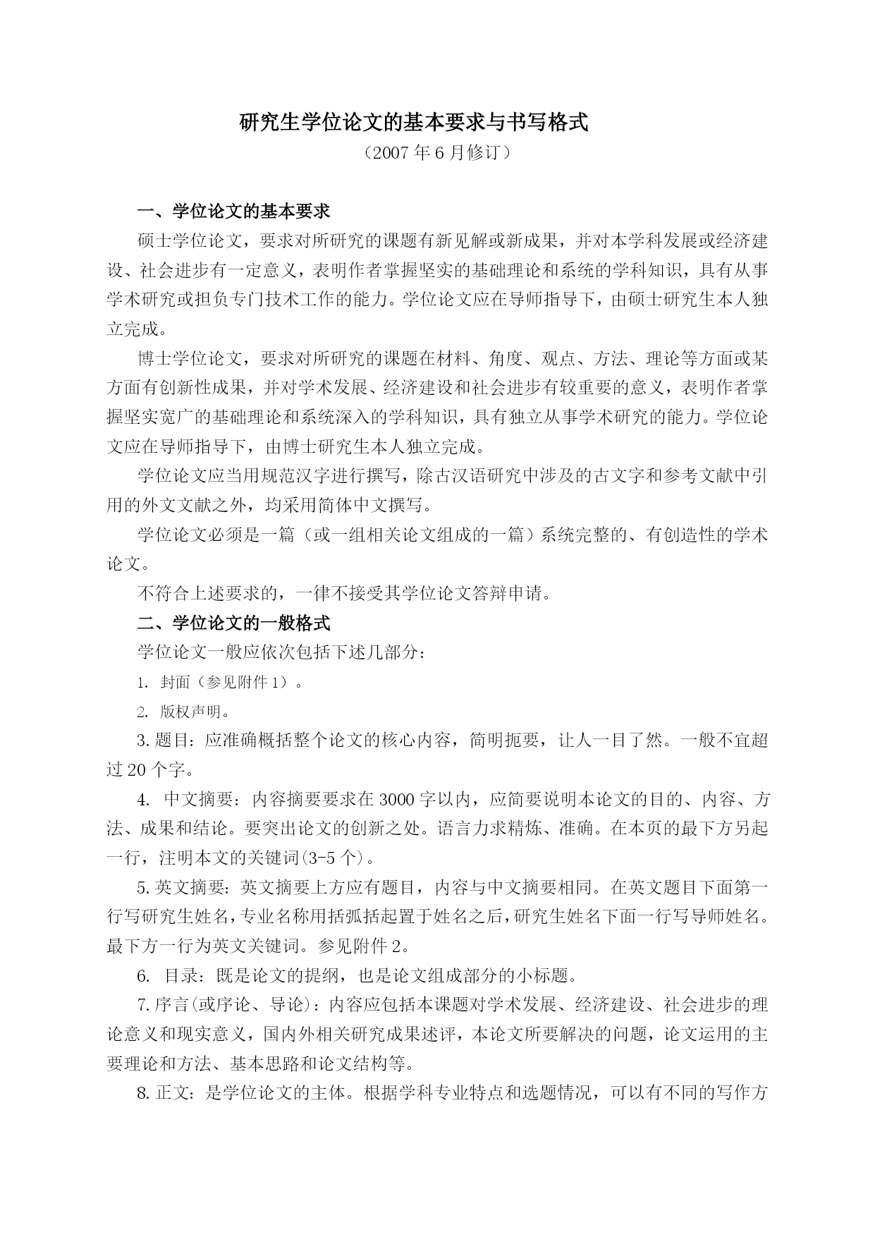 研究生学位论文的基本要求与书写格式(2007年6月修订)一、学位论文的基本要求硕士学位论文,要求对所研究的课题有新见解或新成果,并对本学科发展或经济建设、社会进步有一定意义,表明作者掌握坚实的基础理论和系统的学科知识,具有从事学术研究或担负专门技术工作的能力。学位论文应在导师指导下,由硕士研究生本人独立完成。博士学位论文,要求对所研究的课题在材料、角度、观点、方法、理论等方面或某方面有创新性成果,并对学术发展、经济建设和社会进步有较重要的意义,表明作者掌握坚实宽广的基础理论和系统深入的学科知识,具有独立从