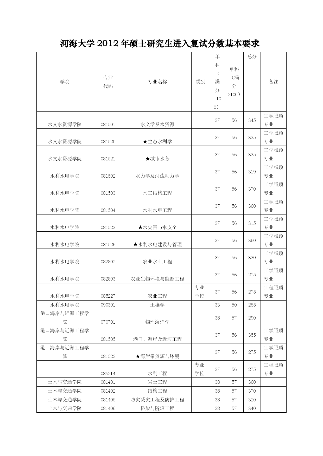 河海大学2012年硕士研究生进入复试分数基本要求学院专业代码专业名称类别单科(满分=100)单科(满分>100)总分备注水文水资源学院081501水文学及水资源3756345工学照顾专业水文水资源学院081520★生态水利学3756335工学照顾专业水文水资源学院081521★城市水务3756335工学照顾专业水利水电学院081502水力学及河流动力学3756319工学照顾专业水利水电学院081503水工结构工程3756370工学照顾专业水利水电学院081504水利水电工程3756360工学照顾专业水利水