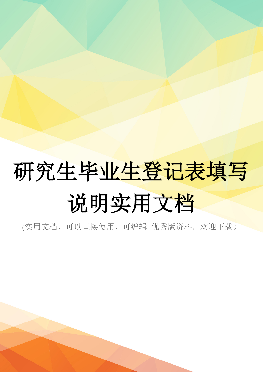 研究生毕业生登记表填写说明实用文档(实用文档,可以直接使用,可编辑优秀版资料,欢迎下载)毕业生登记表填写指导封面:毕业研究生登记表学校东北大学系XXXX学院专业XXXXX姓名XXX学位XX学位(工学、法学等等)第一页:姓名XXX性别X曾用名XXX(没有的写“无")出生年月日(必须与身份证保持一致,否则将影响政审、出国等)家庭出身XX(工人、农民、教师、干部、军人等等)本人成分XX(除了军人及委托培养以外的同学都应填写“学生”)籍贯XXXXXXXXX民族X现在家庭住址XXXXXXXXXXXXXXX(这一项一