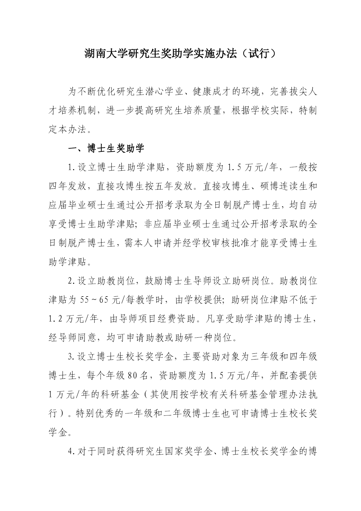 湖南大学研究生奖助学实施办法(试行)为不断优化研究生潜心学业、健康成才的环境,完善拔尖人才培养机制,进一步提高研究生培养质量,根据学校实际,特制定本办法。一、博士生奖助学1.设立博士生助学津贴,资助额度为1.5万元/年,一般按四年发放,直接攻博生按五年发放。直接攻博生、硕博连读生和应届毕业硕士生通过公开招考录取为全日制脱产博士生,均自动享受博士生助学津贴;非应届毕业硕士生通过公开招考录取的全日制脱产博士生,需本人申请并经学校审核批准才能享受博士生助学津贴。2.设立助教岗位,鼓励博士生导师设立助研岗位。助教