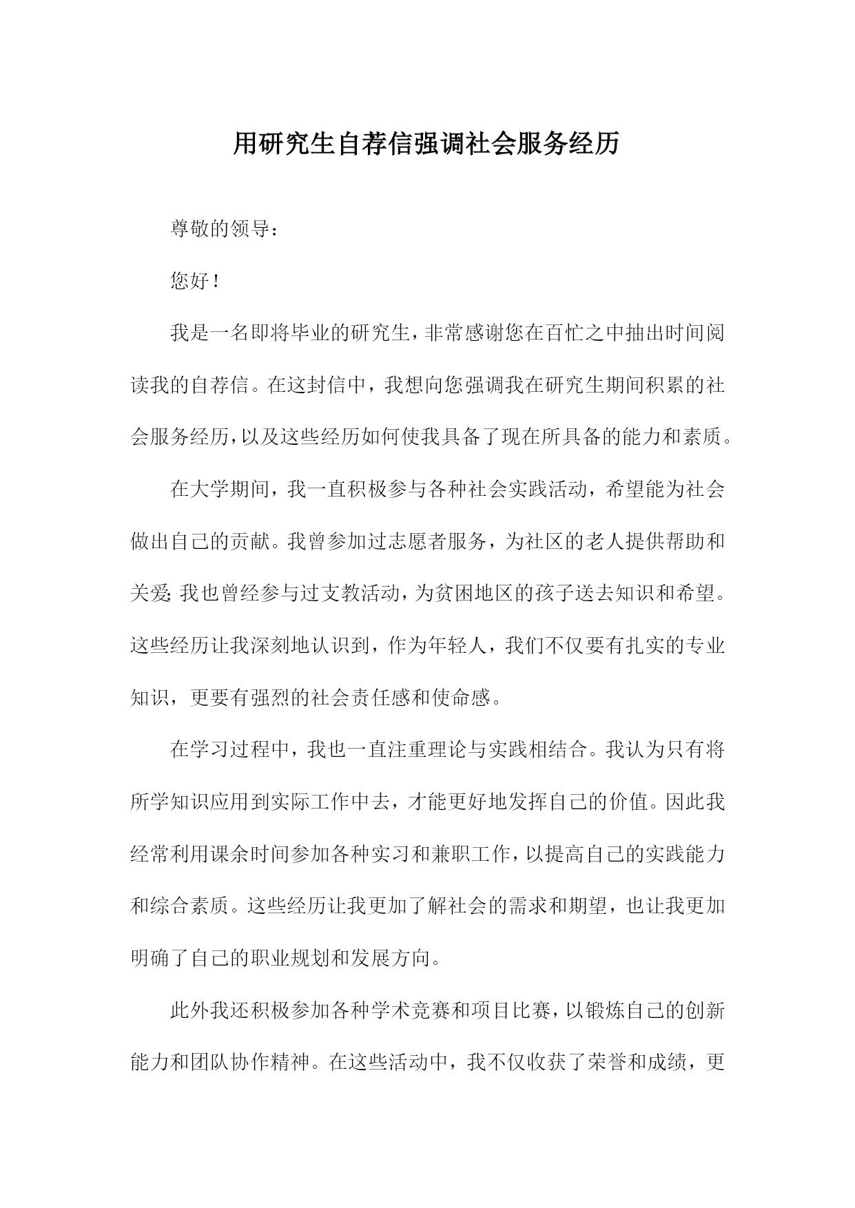 用研究生自荐信强调社会服务经历尊敬的领导:您好!我是一名即将毕业的研究生,非常感谢您在百忙之中抽出时间阅读我的自荐信。在这封信中,我想向您强调我在研究生期间积累的社会服务经历,以及这些经历如何使我具备了现在所具备的能力和素质。在大学期间,我一直积极参与各种社会实践活动,希望能为社会做出自己的贡献。我曾参加过志愿者服务,为社区的老人提供帮助和关爱;我也曾经参与过支教活动,为贫困地区的孩子送去知识和希望。这些经历让我深刻地认识到,作为年轻人,我们不仅要有扎实的专业知识,更要有强烈的社会责任感和使命感。在学习过