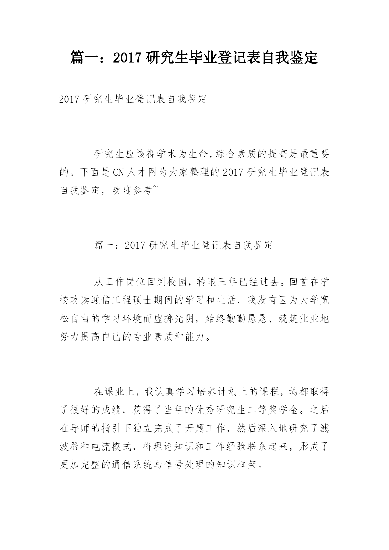 篇一:2017研究生毕业登记表自我鉴定2017研究生毕业登记表自我鉴定研究生应该视学术为生命,综合素质的提高是最重要的。下面是CN人才网为大家整理的2017研究生毕业登记表自我鉴定,欢迎参考~篇一:2017研究生毕业登记表自我鉴定从工作岗位回到校园,转眼三年已经过去。回首在学校攻读通信工程硕士期间的学习和生活,我没有因为大学宽松自由的学习环境而虚掷光阴,始终勤勤恳恳、兢兢业业地努力提高自己的专业素质和能力。在课业上,我认真学习培养计划上的课程,均都取得了很好的成绩,获得了当年的优秀研究生二等奖学金。之后在