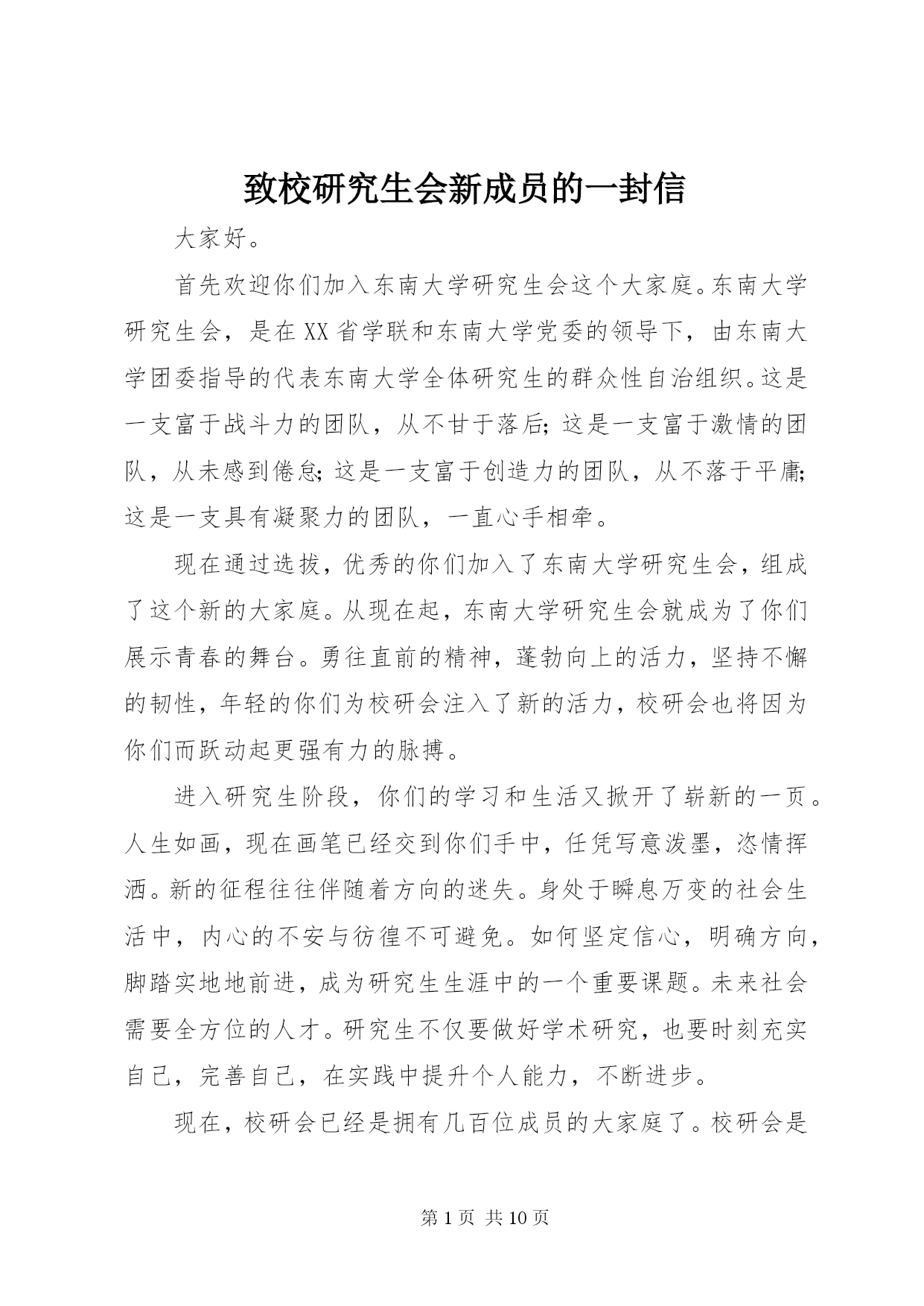 第PAGE\*Arabic\*MERGEFORMAT10页共NUMPAGES\*MERGEFORMAT10页致校研究生会新成员的一封信大家好。首先欢迎你们加入东南大学研究生会这个大家庭。东南大学研究生会,是在XX省学联和东南大学党委的领导下,由东南大学团委指导的代表东南大学全体研究生的群众性自治组织。这是一支富于战斗力的团队,从不甘于落后;这是一支富于激情的团队,从未感到倦怠;这是一支富于创造力的团队,从不落于平庸;这是一支具有凝聚力的团队,一直心手相牵。现在通过选拔,优秀的你们加入了东南大学