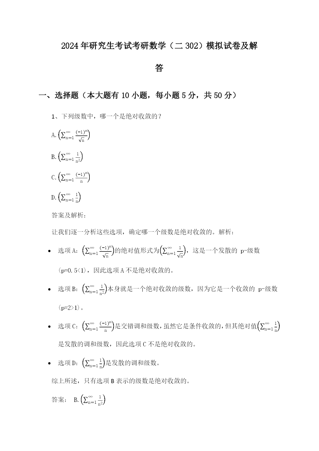 2024年研究生考试考研数学(二302)模拟试卷及解答一、选择题(本大题有10小题,每小题5分,共50分)1、下列级数中,哪一个是绝对收敛的?A.n=1∞−1nnB.n=1∞1n2C.n=1∞−1nnD.n=1∞1n答案及解析:让我们逐一分析这些选项,确定哪一个级数是绝对收敛的。解析:选项A:n=1∞−1nn的绝对值形式为n=1∞1n,这是一个发散的p-级数(p=0.5<1),因此选项A不是绝对收敛的。选项B:n=1∞1n2本身就是一个绝对收敛的级数,因为它是一个收敛的p-级数(p=2>1)。选项C:n=
