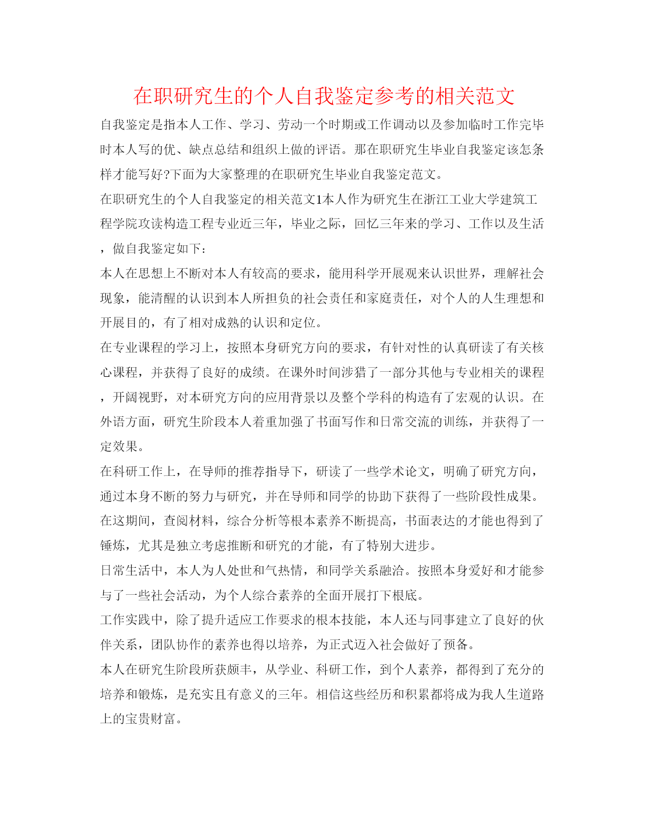 在职研究生的个人自我鉴定参考的相关范文自我鉴定是指本人工作、学习、劳动一个时期或工作调动以及参加临时工作完毕时本人写的优、缺点总结和组织上做的评语。那在职研究生毕业自我鉴定该怎条样才能写好?下面为大家整理的在职研究生毕业自我鉴定范文。在职研究生的个人自我鉴定的相关范文1本人作为研究生在浙江工业大学建筑工程学院攻读构造工程专业近三年,毕业之际,回忆三年来的学习、工作以及生活,做自我鉴定如下:本人在思想上不断对本人有较高的要求,能用科学开展观来认识世界,理解社会现象,能清醒的认识到本人所担负的社会责任和家庭责