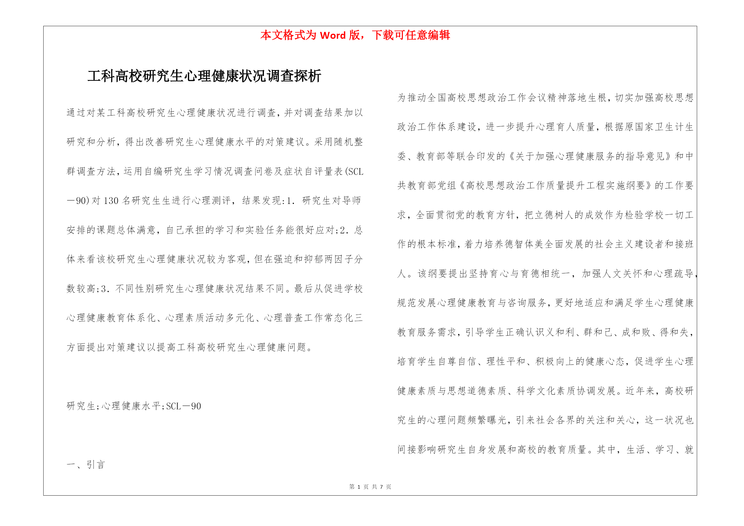 工科高校研究生心理健康状况调查探析.docx