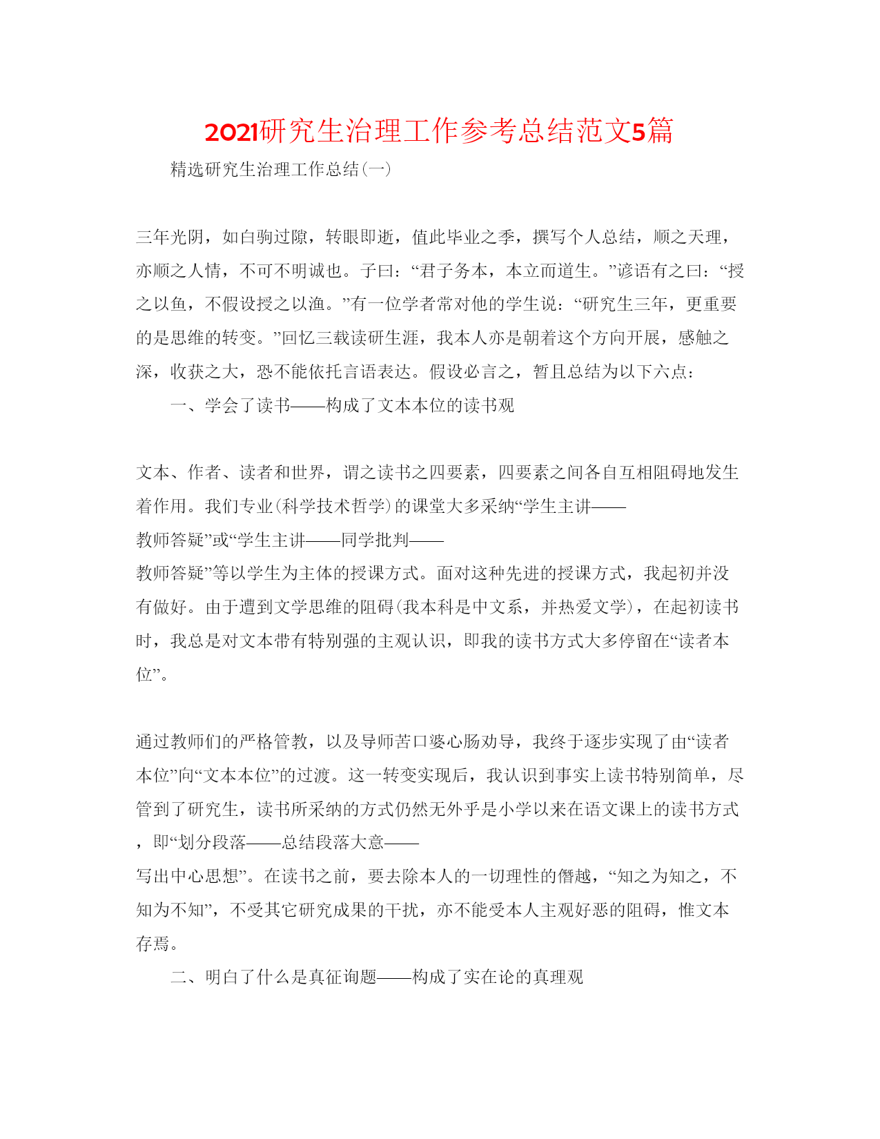 2021研究生治理工作参考总结范文5篇精选研究生治理工作总结(一)三年光阴,如白驹过隙,转眼即逝,值此毕业之季,撰写个人总结,顺之天理,亦顺之人情,不可不明诚也。子曰:“君子务本,本立而道生。”谚语有之曰:“授之以鱼,不假设授之以渔。”有一位学者常对他的学生说:“研究生三年,更重要的是思维的转变。”回忆三载读研生涯,我本人亦是朝着这个方向开展,感触之深,收获之大,恐不能依托言语表达。假设必言之,暂且总结为以下六点:一、学会了读书——构成了文本本位的读书观文本、作者、读者和世界,谓之读书之四要素,四要素之间
