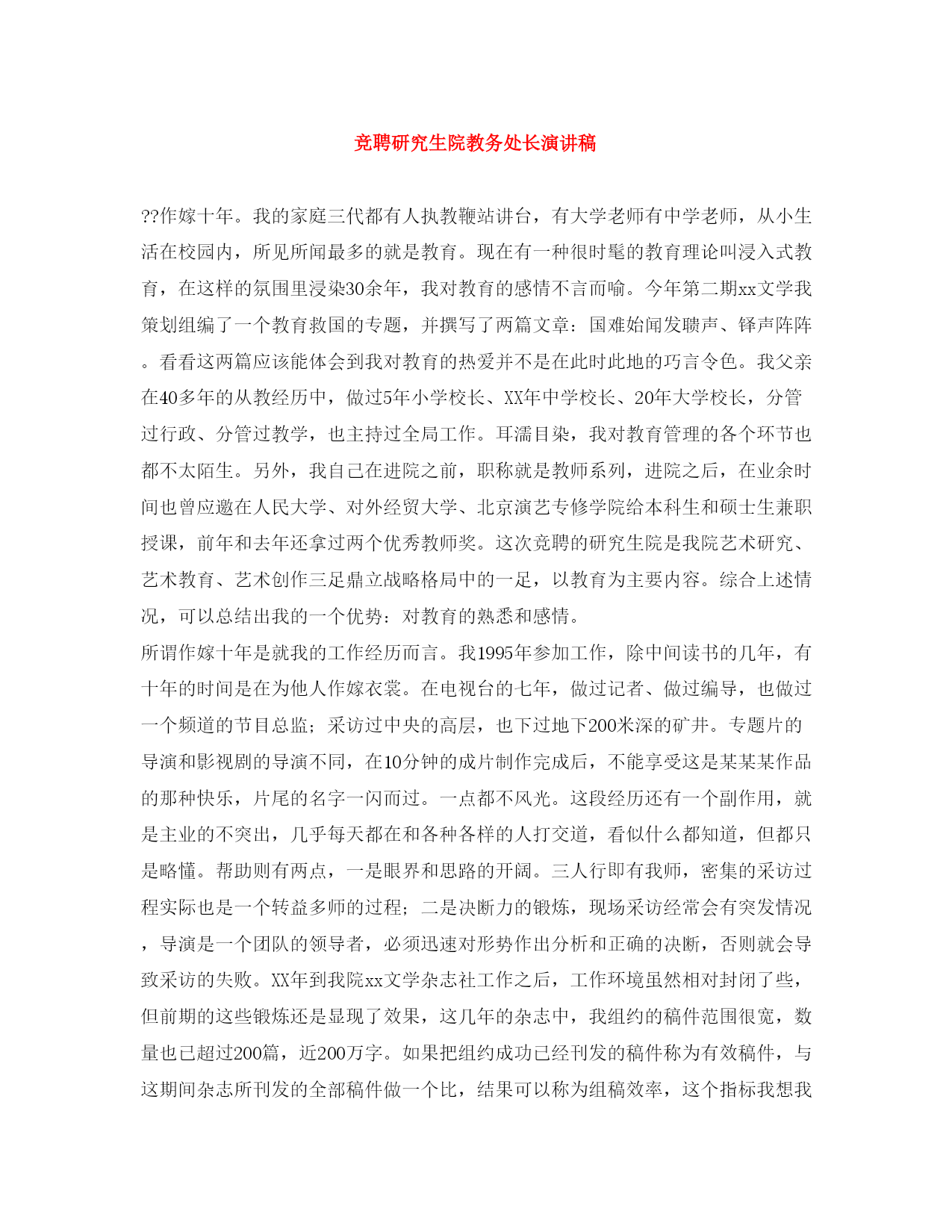 此资料由网络收集而来,如有侵权请告知上传者立即删除。资料共分享,我们负责传递知识。竞聘研究生院教务处长演讲稿??作嫁十年。我的家庭三代都有人执教鞭站讲台,有大学老师有中学老师,从小生活在校园内,所见所闻最多的就是教育。现在有一种很时髦的教育理论叫浸入式教育,在这样的氛围里浸染30余年,我对教育的感情不言而喻。今年第二期xx文学我策划组编了一个教育救国的专题,并撰写了两篇文章:国难始闻发聩声、铎声阵阵。看看这两篇应该能体会到我对教育的热爱并不是在此时此地的巧言令色。我父亲在40多年的从教经历中,做过5年小学