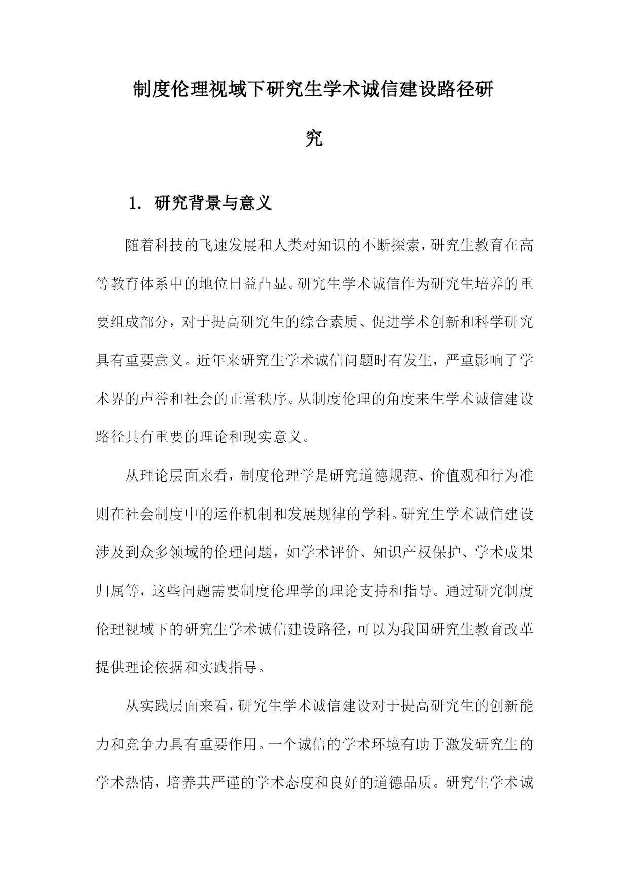 制度伦理视域下研究生学术诚信建设路径研究1.研究背景与意义随着科技的飞速发展和人类对知识的不断探索,研究生教育在高等教育体系中的地位日益凸显。研究生学术诚信作为研究生培养的重要组成部分,对于提高研究生的综合素质、促进学术创新和科学研究具有重要意义。近年来研究生学术诚信问题时有发生,严重影响了学术界的声誉和社会的正常秩序。从制度伦理的角度来生学术诚信建设路径具有重要的理论和现实意义。从理论层面来看,制度伦理学是研究道德规范、价值观和行为准则在社会制度中的运作机制和发展规律的学科。研究生学术诚信建设涉及到众多
