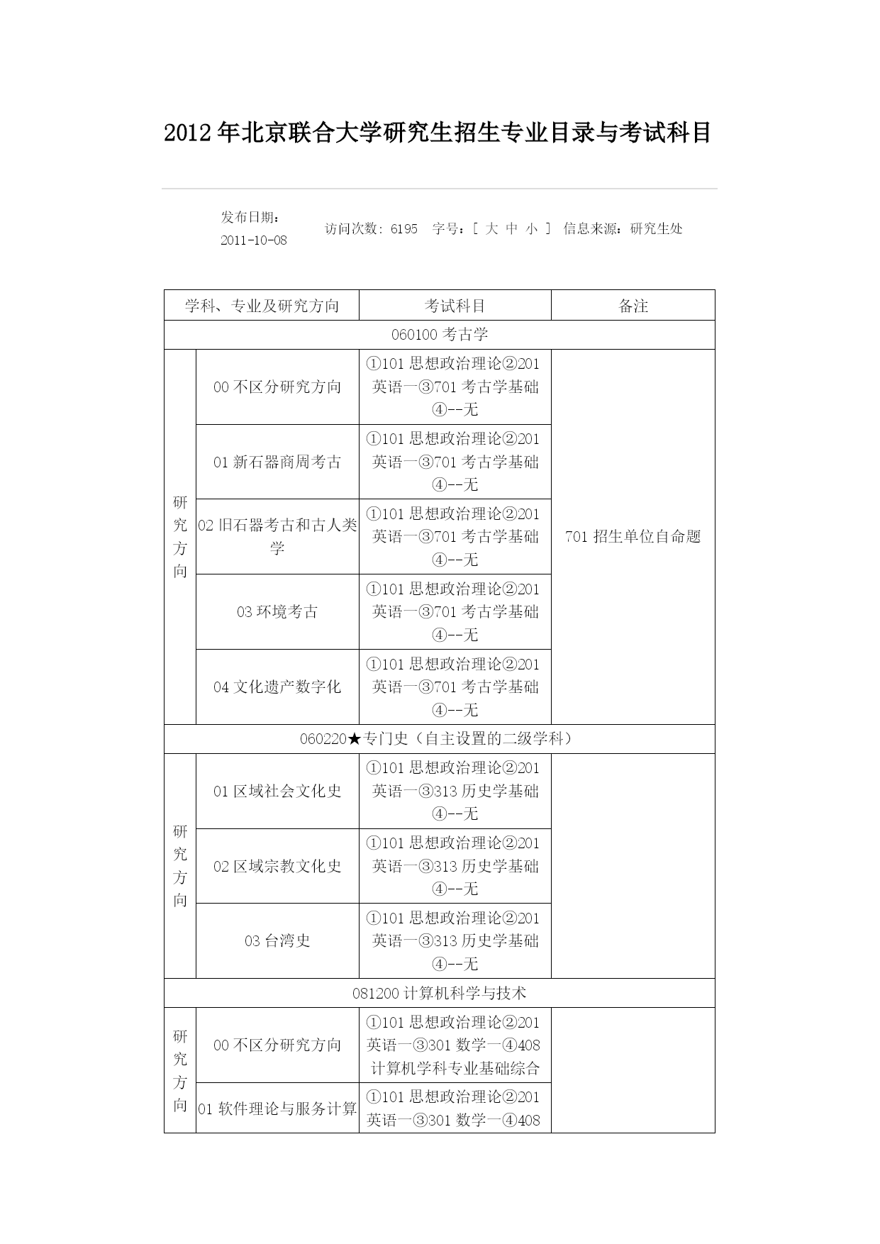 2012年北京联合大学研究生招生专业目录与考试科目发布日期:2011-10-08访问次数:6195字号:[HYPERLINK"javascript:doZoom(18)"大HYPERLINK"javascript:doZoom(16)"中HYPERLINK"javascript:doZoom(14)"小]信息来源:研究生处学科、专业及研究方向考试科目备注060100考古学研究方向00不区分研究方向①101思想政治理论②201英语一③701考古学基础④--无701招生单位自命题01新石器商