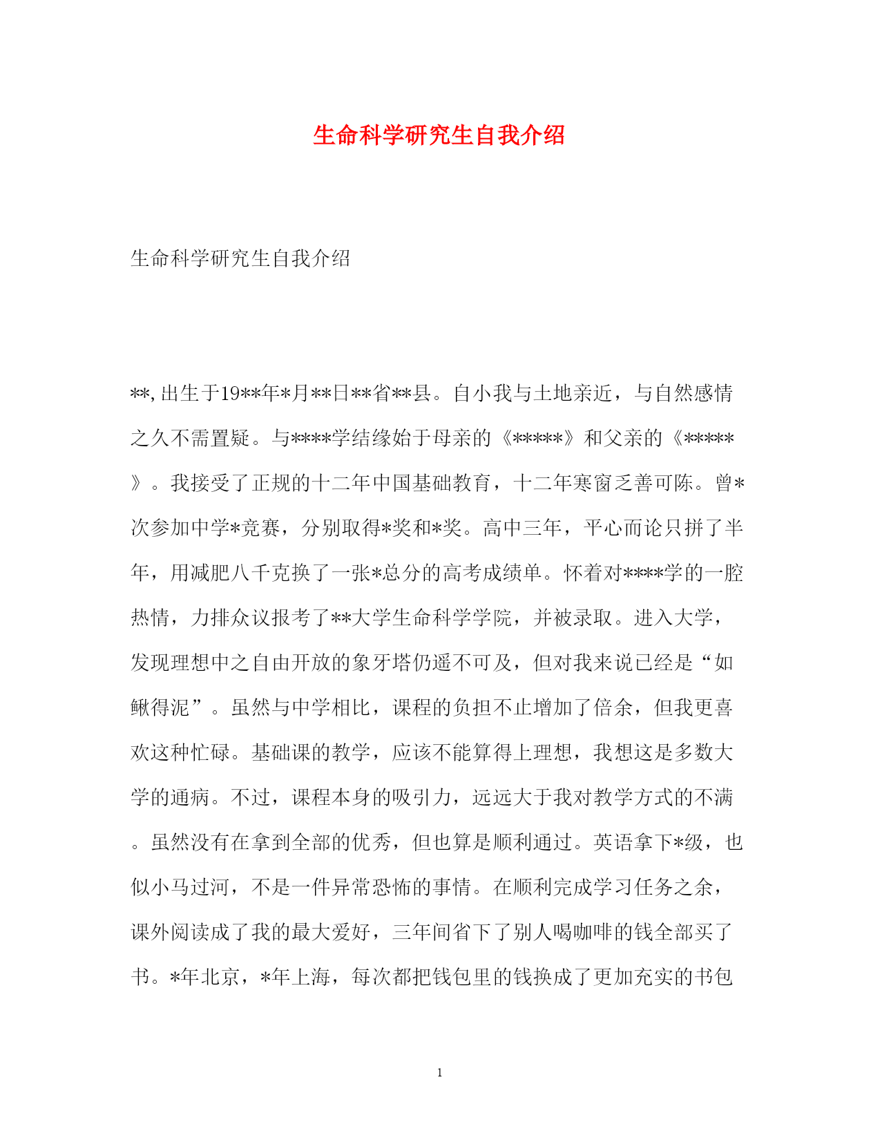 此资料由网络收集而来,如有侵权请告知上传者立即删除。资料共分享,我们负责传递知识。PAGEPAGE3生命科学研究生自我介绍生命科学研究生自我介绍**,出生于19**年*月**日**省**县。自小我与土地亲近,与自然感情之久不需置疑。与****学结缘始于母亲的《*****》和父亲的《*****》。我接受了正规的十二年中国基础教育,十二年寒窗乏善可陈。曾*次参加中学*竞赛,分别取得*奖和*奖。高中三年,平心而论只拼了半年,用减肥八千克换了一张*总分的高考成绩单。怀着对****学的一腔热情,力排众议