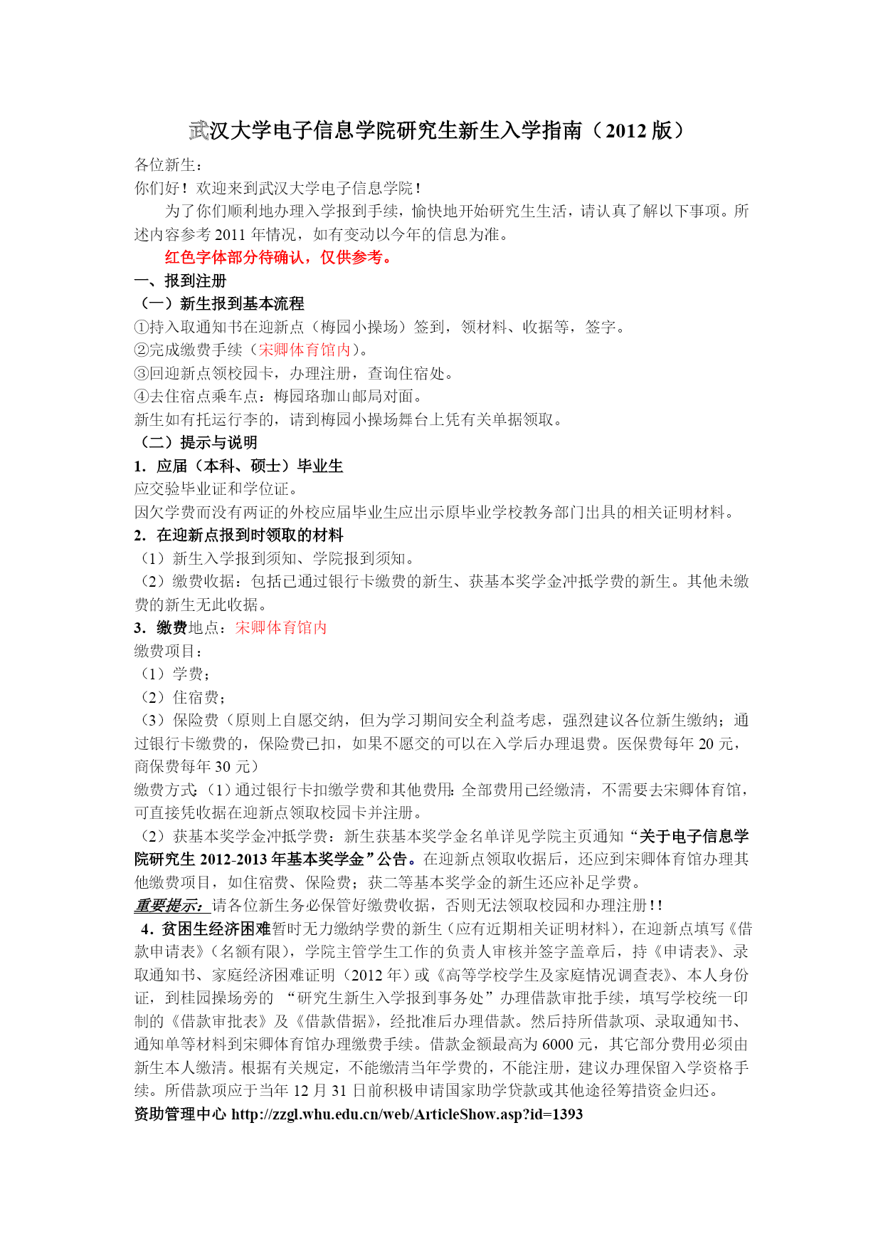武汉大学电子信息学院研究生新生入学指南(2012版)各位新生:你们好!欢迎来到武汉大学电子信息学院!为了你们顺利地办理入学报到手续,愉快地开始研究生生活,请认真了解以下事项。所述内容参考2011年情况,如有变动以今年的信息为准。红色字体部分待确认,仅供参考。一、报到注册(一)新生报到基本流程①持入取通知书在迎新点(梅园小操场)签到,领材料、收据等,签字。②完成缴费手续(宋卿体育馆内)。③回迎新点领校园卡,办理注册,查询住宿处。④去住宿点乘车点:梅园珞珈山邮局对面。新生如有托运行李的,请到梅园小操场舞台上凭
