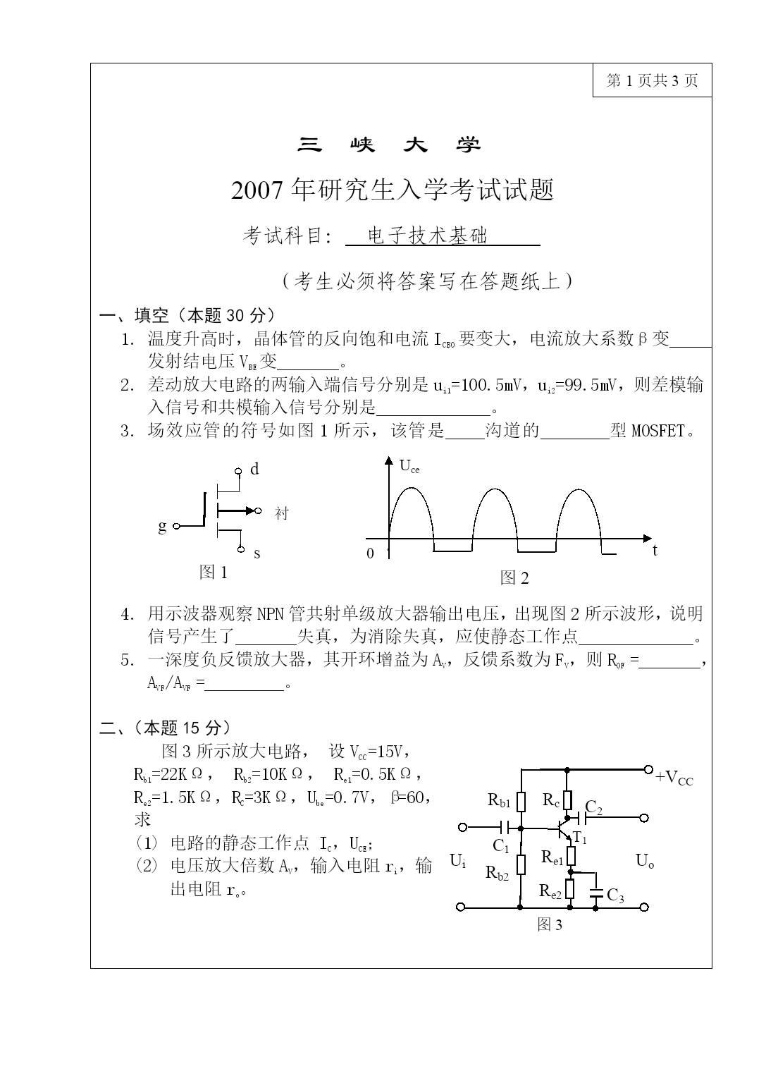 三峡大学2007年研究生入学考试试题考试科目:电子技术基础(考生必须将答案写在答题纸上)一、填空(本题30分)温度升高时,晶体管的反向饱和电流ICBO要变大,电流放大系数β变,发射结电压VBE变。差动放大电路的两输入端信号分别是ui1=100.5mV,ui2=99.5mV,则差模输入信号和共模输入信号分别是。场效应管的符号如图1所示,该管是沟道的型MOSFET。gds衬0tUce图1图2用示波器观察NPN管共射单级放大器输出电压,出现图2所示波形,说明信号产生了失真,为消除失真,应使静态工作点。一深度负反