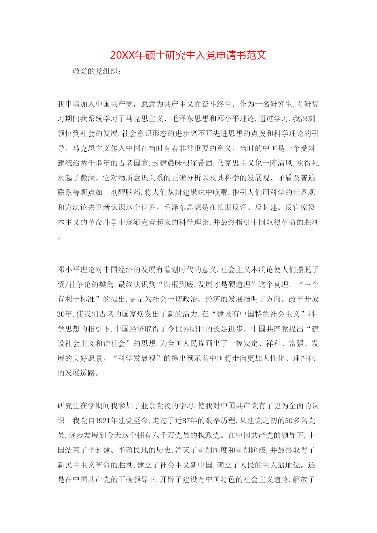 20XX年硕士研究生入党申请书范文敬爱的党组织:我申请加入中国共产党,愿意为共产主义而奋斗终生。作为一名研究生,考研复习期间我系统学习了马克思主义、毛泽东思想和邓小平理论,通过学习,我深刻领悟到社会的发展,社会意识形态的进步离不开先进思想的点拨和科学理论的引导。马克思主义传入中国在当时有着非常重要的意义。当时的中国是一个受封建统治两千多年的古老国家,封建愚昧根深蒂固,马克思主义象一阵清风,吹得死水起了微澜。它对物质意识关系的正确分析以及其科学的发展观、矛盾及普遍联系等观点如一剂醒脑药,将人们从封建愚昧中唤