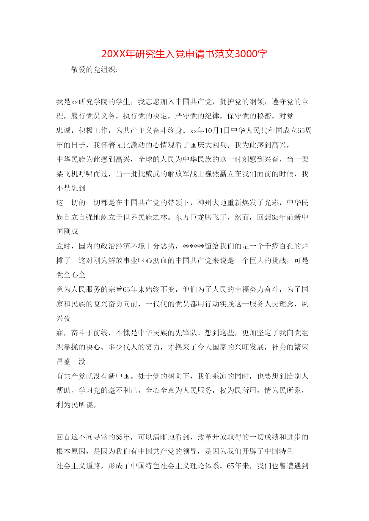 20XX年研究生入党申请书范文3000字敬爱的党组织:我是xx研究学院的学生,我志愿加入中国共产党,拥护党的纲领,遵守党的章程,履行党员义务,执行党的决定,严守党的纪律,保守党的秘密,对党忠诚,积极工作,为共产主义奋斗终身。xx年10月1日中华人民共和国成立65周年的日子,我怀着无比激动的心情观看了国庆大阅兵。我为此感到高兴,中华民族为此感到高兴,全球的人民为中华民族的这一时刻感到兴奋。当一架架飞机呼啸而过,当一批批威武的解放军战士巍然矗立在我们面前的时候,我不禁想到这一切的一切都是在中国共产党的带领下,