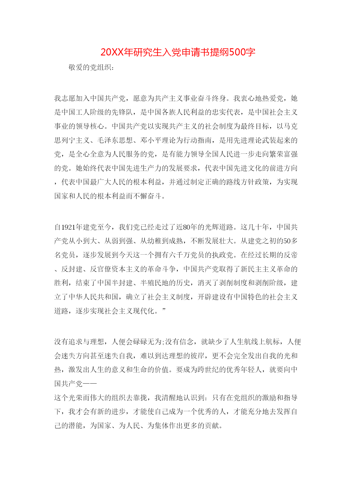 20XX年研究生入党申请书提纲500字敬爱的党组织:我志愿加入中国共产党,愿意为共产主义事业奋斗终身。我衷心地热爱党,她是中国工人阶级的先锋队,是中国各族人民利益的忠实代表,是中国社会主义事业的领导核心。中国共产党以实现共产主义的社会制度为最终目标,以马克思列宁主义、毛泽东思想、邓小平理论为行动指南,是用先进理论武装起来的党,是全心全意为人民服务的党,是有能力领导全国人民进一步走向繁荣富强的党。她始终代表中国先进生产力的发展要求,代表中国先进文化的前进方向,代表中国最广大人民的根本利益,并通过制定正确的路