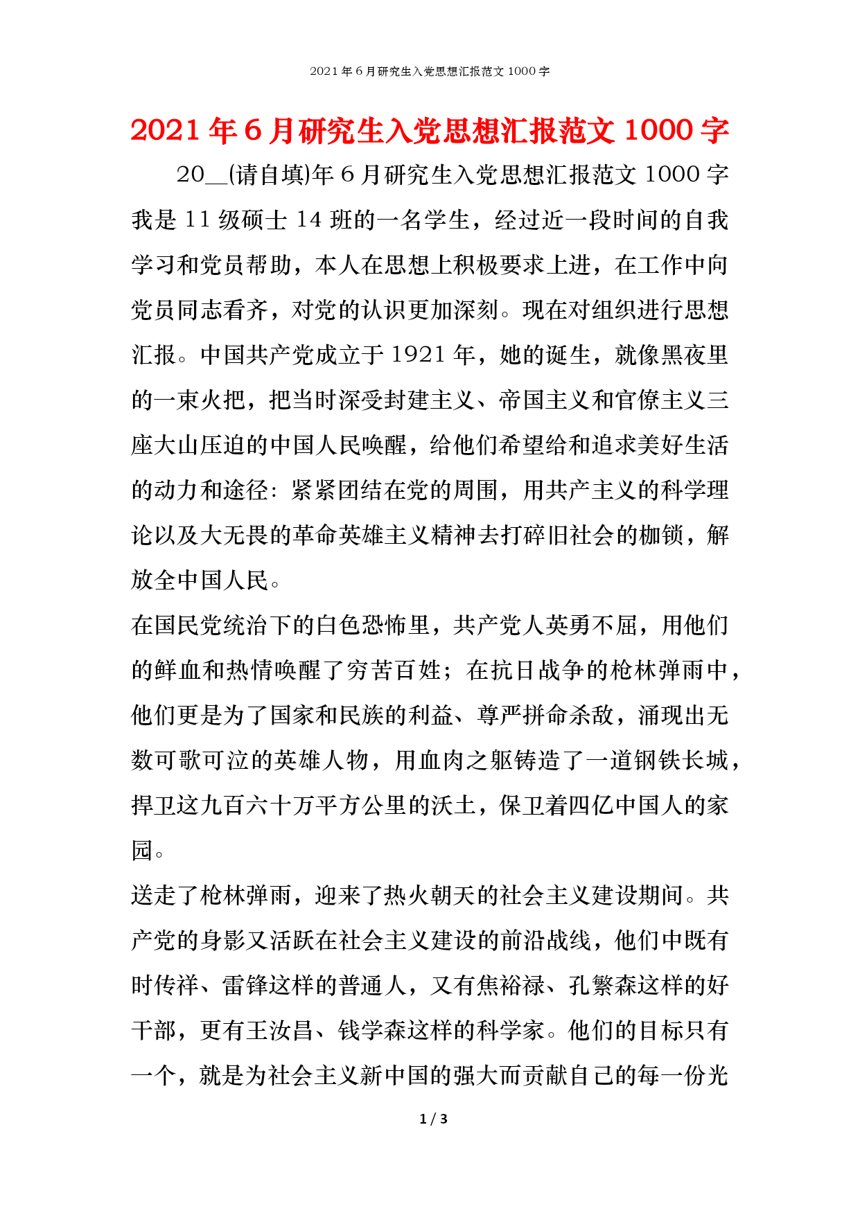 2021年6月研究生入党思想汇报范文1000字.docx