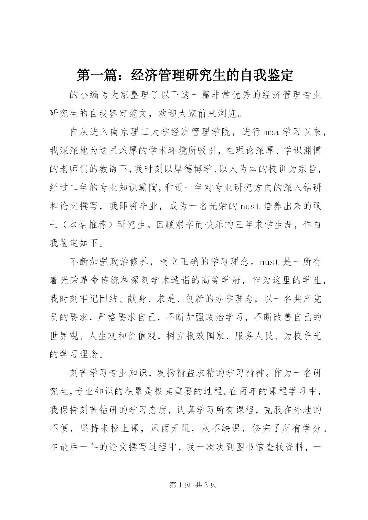 第PAGE\*Arabic\*MERGEFORMAT3页共NUMPAGES\*MERGEFORMAT3页第一篇:经济管理研究生的自我鉴定的小编为大家整理了以下这一篇非常优秀的经济管理专业研究生的自我鉴定范文,欢迎大家前来浏览。自从进入南京理工大学经济管理学院,进行mba学习以来,我深深地为这里浓厚的学术环境所吸引,在理论深厚、学识渊博的老师们的教诲下,我时刻以厚德博学、以人为本的校训为宗旨,经过二年的专业知识熏陶,和近一年对专业研究方向的深入钻研和论文撰写,我即将毕业,成为一名光荣的nust培
