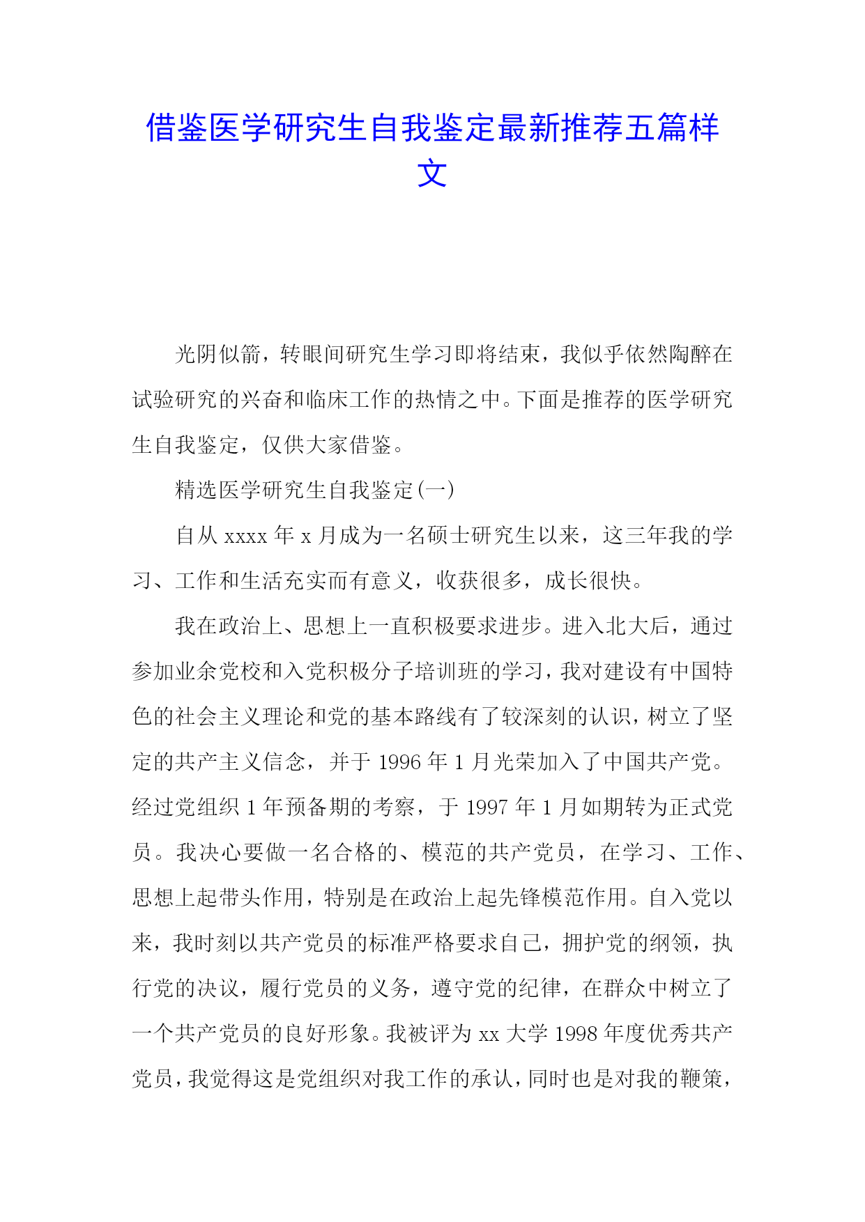 借鉴医学研究生自我鉴定最新推荐五篇样文光阴似箭,转眼间研究生学习即将结束,我似乎依然陶醉在试验研究的兴奋和临床工作的热情之中。下面是推荐的医学研究生自我鉴定,仅供大家借鉴。精选医学研究生自我鉴定(一)自从xxxx年x月成为一名硕士研究生以来,这三年我的学习、工作和生活充实而有意义,收获很多,成长很快。我在政治上、思想上一直积极要求进步。进入北大后,通过参加业余党校和入党积极分子培训班的学习,我对建设有中国特色的社会主义理论和党的基本路线有了较深刻的认识,树立了坚定的共产主义信念,并于1996年1月光荣加入