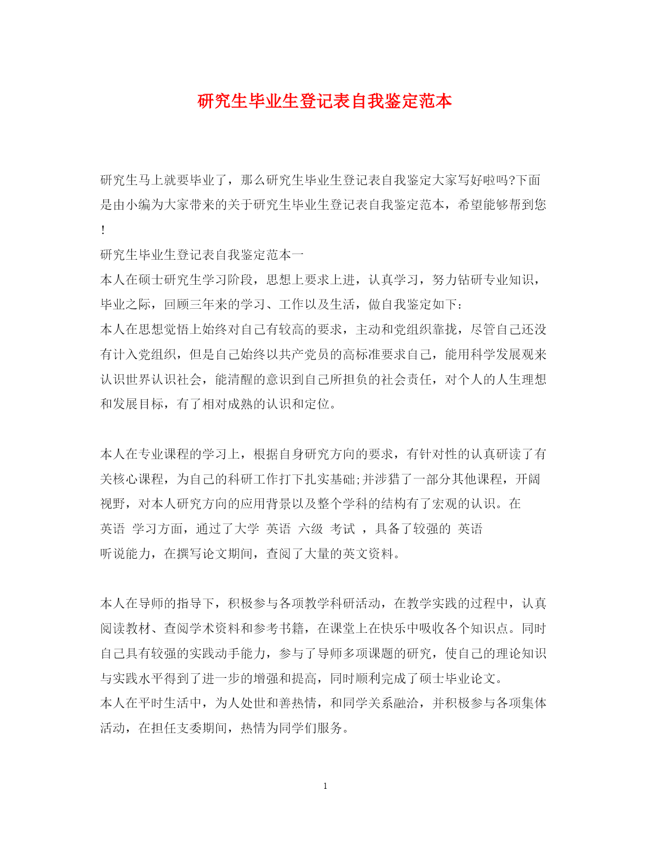 此资料由网络收集而来,如有侵权请告知上传者立即删除。资料共分享,我们负责传递知识。PAGEPAGE6研究生毕业生登记表的自我鉴定范文研究生三年的学习收获颇丰,从学业、科研工作,到个人素质,都得到了充分的培养和锻炼,这些经历和积累都将成为我人生道路上的宝贵财富。激励我在以后的学习生活中继续前进。下面是关于研究生毕业生登记表自我鉴定范文,欢迎阅读!毕业研究生登记表中的自我鉴定范文一:本人在硕士研究生学习阶段,作为一名中共党员,思想积极上进,热爱祖国,热爱人民,拥护中国共产党的领导,拥护党的各项方针