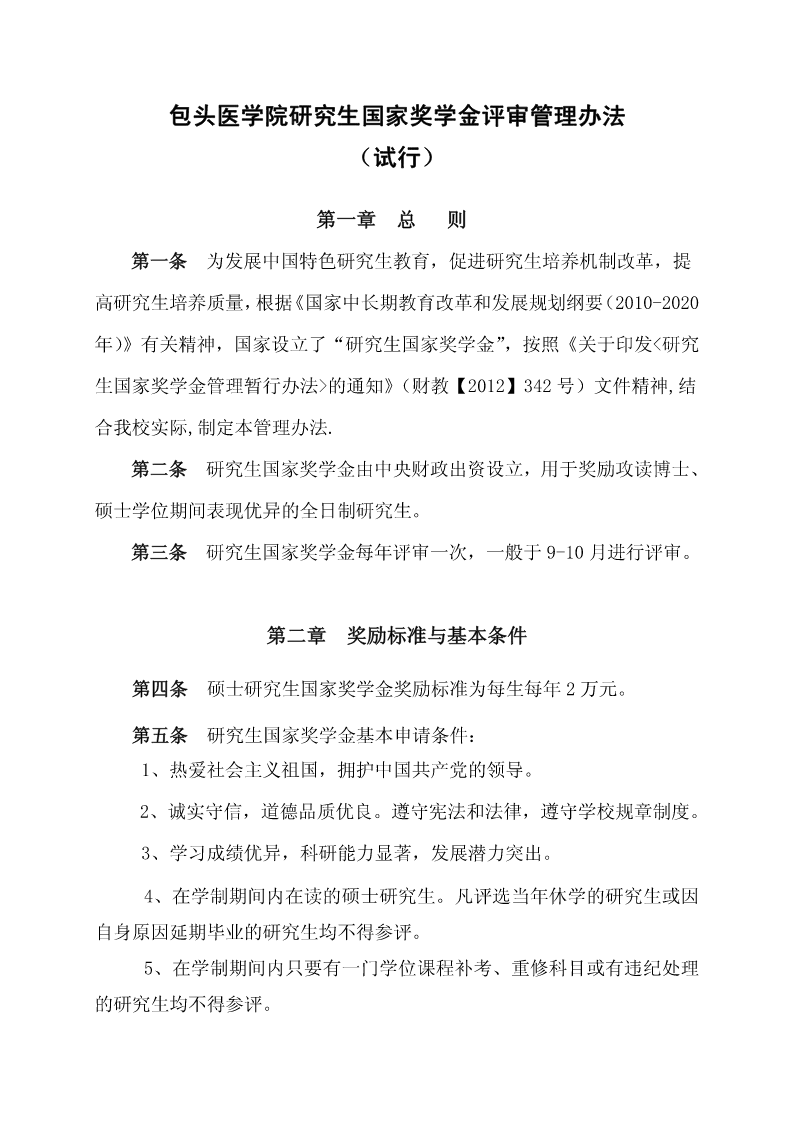 包头医学院研究生国家奖学金评审管理办法(试行)第一章总则第一条为发展中国特色研究生教育,促进研究生培养机制改革,提高研究生培养质量,根据《国家中长期教育改革和发展规划纲要(2010-2020年)》有关精神,国家设立了“研究生国家奖学金”,按照《关于印发<研究生国家奖学金管理暂行办法>的通知》(财教【2012】342号)文件精神,结合我校实际,制定本管理办法.第二条研究生国家奖学金由中央财政出资设立,用于奖励攻读博士、硕士学位期间表现优异的全日制研究生。第三条研究生国家奖学金每年评审一次,一般于9-10月进