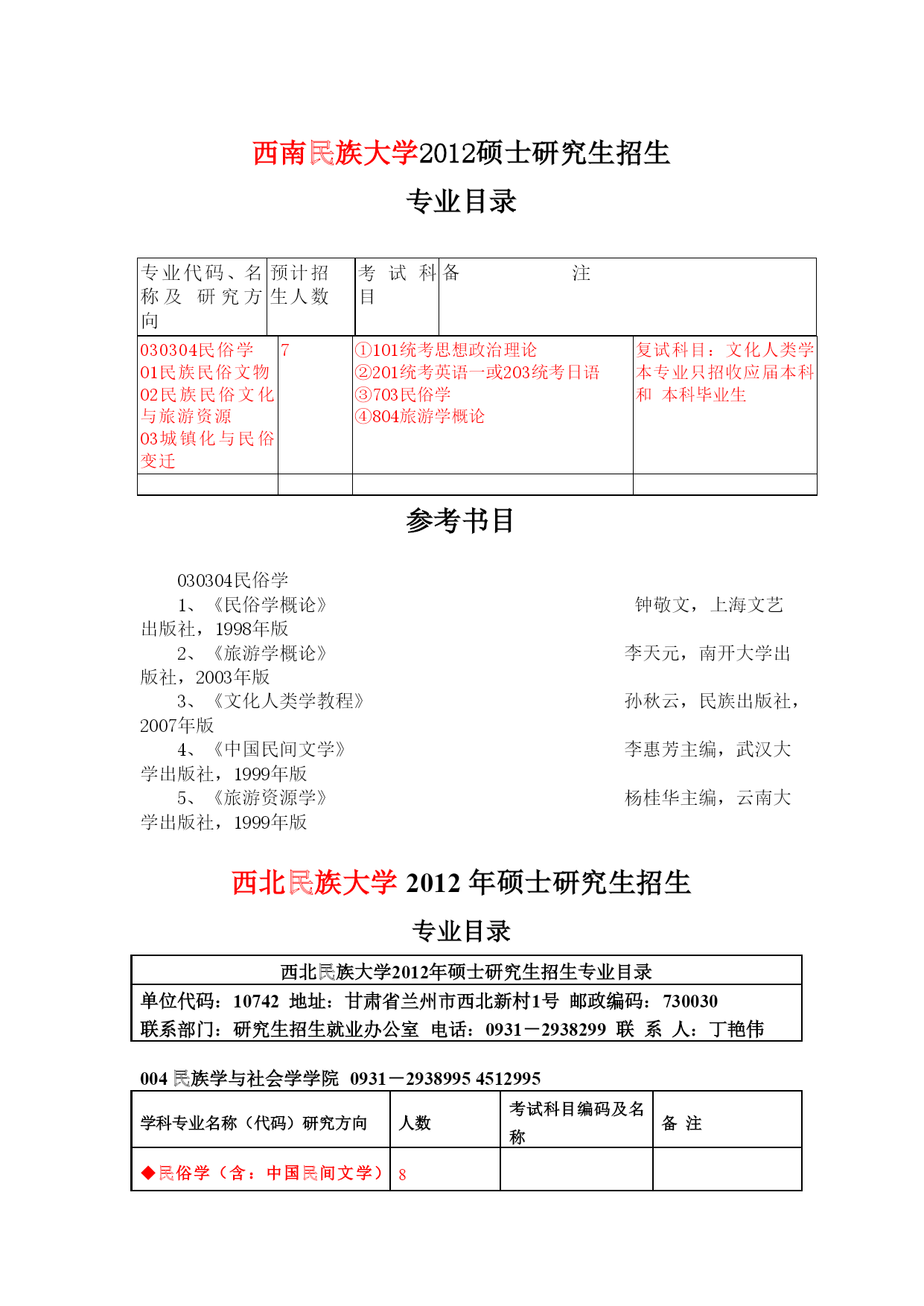 西南民族大学2012硕士研究生招生专业目录专业代码、名称及研究方向预计招生人数考试科目备注030304民俗学01民族民俗文物02民族民俗文化与旅游资源03城镇化与民俗变迁7①101统考思想政治理论②201统考英语一或203统考日语③703民俗学④804旅游学概论复试科目:文化人类学本专业只招收应届本科和本科毕业生参考书目030304民俗学1、《民俗学概论》钟敬文,上海文艺出版社,1998年版2、《旅游学概论》李天元,南开大学出版社,2003年版3、《文化人类学教程》孙秋云,民族出版社,2007年版4、《中