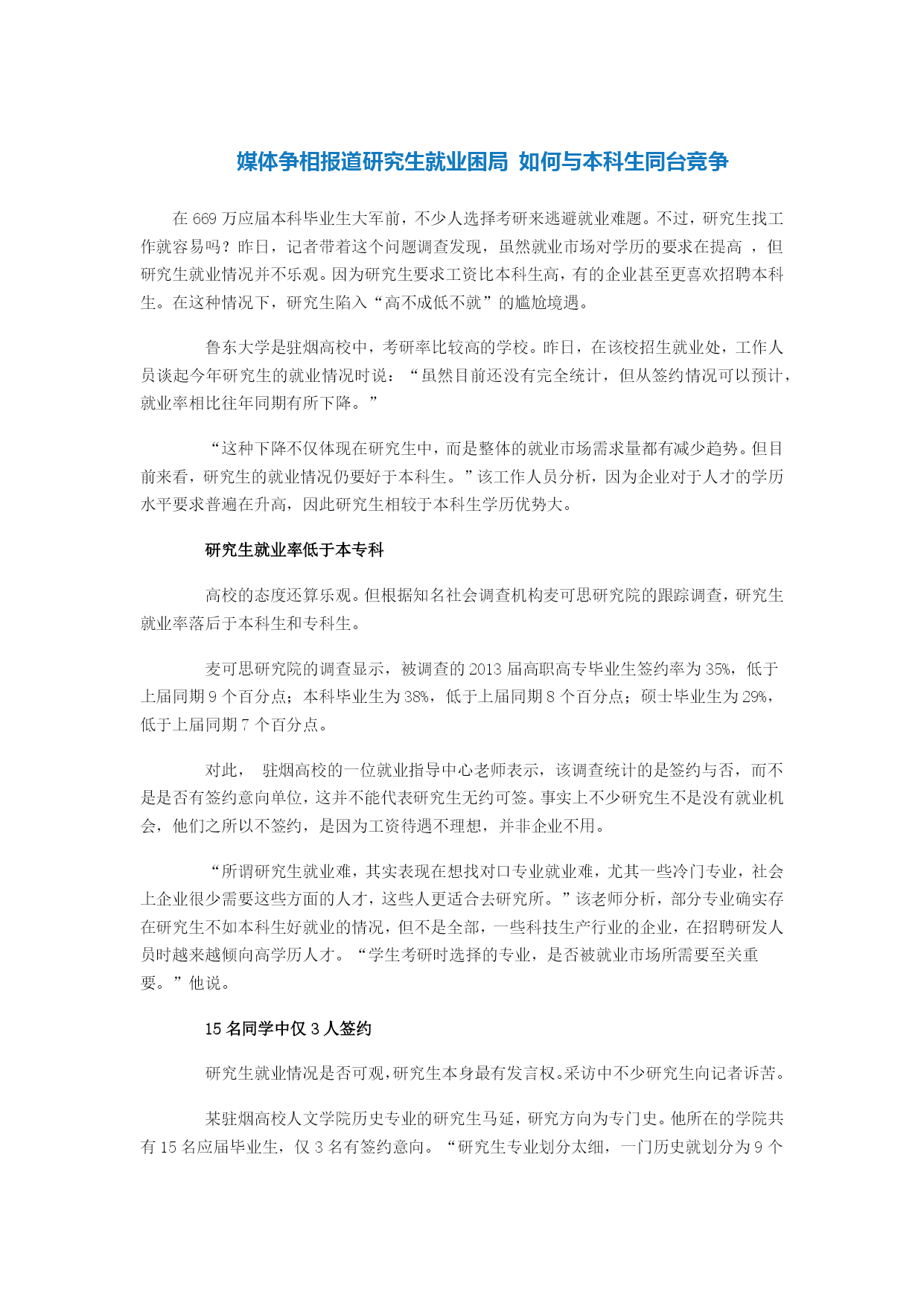 媒体争相报道研究生就业困局 如何与本科生同台竞争.doc