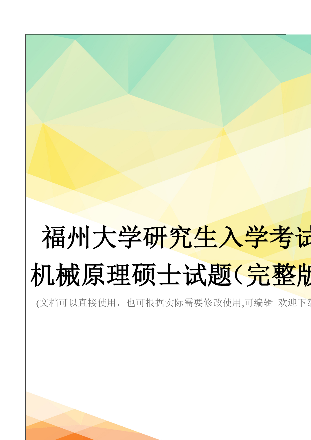 福州大学研究生入学考试机械原理硕士试题(完整版)(文档可以直接使用,也可根据实际需要修改使用,可编辑欢迎下载)福州大学2004年招收硕士/博士研究生入学考试试卷招生学院机械工程及自动化学院招生专业机械制造及其自动化考试科目机械原理科目编号414一、问答题:(40分)1、(3分)从机构结构和组成的观点来看,机构是由哪三部分组成的?2、(3分)机构的级别是如何定级的?3、(4分)双摇杆机构存在的条件是什么?4、(4分)在凸轮机构几种基本的从动件运动规律中,什么运动规律使凸轮机构产生刚性冲击?什么运动规律产生柔
