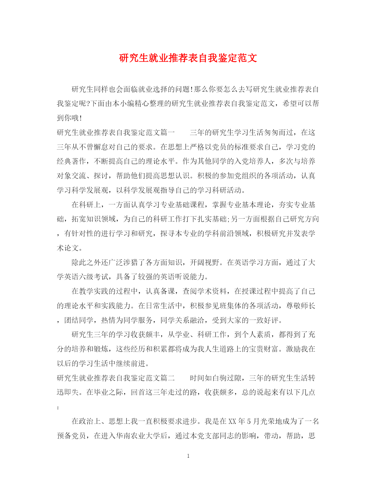 此资料由网络收集而来,如有侵权请告知上传者立即删除。资料共分享,我们负责传递知识。PAGEPAGE4研究生就业推荐表自我鉴定范文研究生同样也会面临就业选择的问题!那么你要怎么去写研究生就业推荐表自我鉴定呢?下面由本小编精心整理的研究生就业推荐表自我鉴定范文,希望可以帮到你哦!研究生就业推荐表自我鉴定范文篇一三年的研究生学习生活匆匆而过,在这三年从不曾懈怠对自己的要求。在思想上严格以党员的标准要求自己,学习党的经典著作,不断提高自己的理论水平。作为其他同学的入党培养人,多次与培养对象交流、探讨,