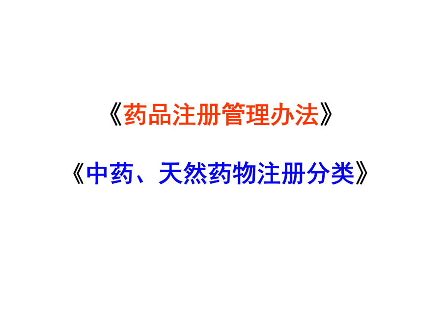 《药品注册管理办法》《中药、天然药物注册分类》国家食品药品监督管理局令第28号一、《药品注册管理办法》章节设置1、药品注册的定义:第三条药品注册,是指国家食品药品监督管理局根据药品注册申请人的申请,依照法定程序,对拟上市销售药品的安全性、有效性、质量可控性等进行审查,并决定是否同意其申请的审批过程。说明:原《办法》第三条为:“…进行系统评价…”。2、特殊审批:第四条:国家鼓励研究创制新药,对创制的新药、治疗疑难危重疾病的新药实行特殊审批。第四十五条:国家食品药品监督管理局对下列申请可以实行特殊审批:(一)