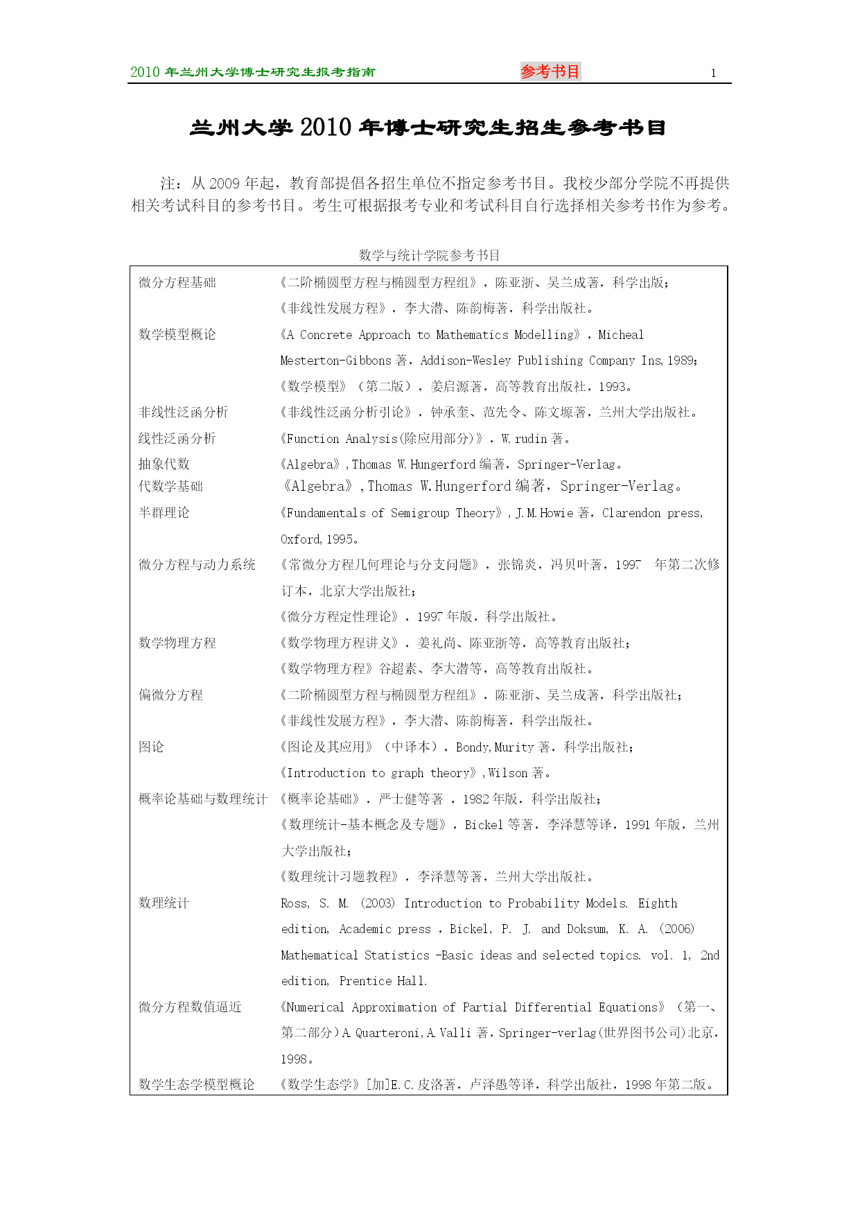 2010年兰州大学博士研究生报考指南参考书目兰州大学2010年博士研究生招生参考书目注:从2009年起,教育部提倡各招生单位不指定参考书目。我校少部分学院不再提供相关考试科目的参考书目。考生可根据报考专业和考试科目自行选择相关参考书作为参考。数学与统计学院参考书目微分方程基础《二阶椭圆型方程与椭圆型方程组》,陈亚浙、吴兰成著,科学出版;《非线性发展方程》,李大潜、陈韵梅著,科学出版社。数学模型概论《AConcreteApproachtoMathematicsModelling》,MichealMester