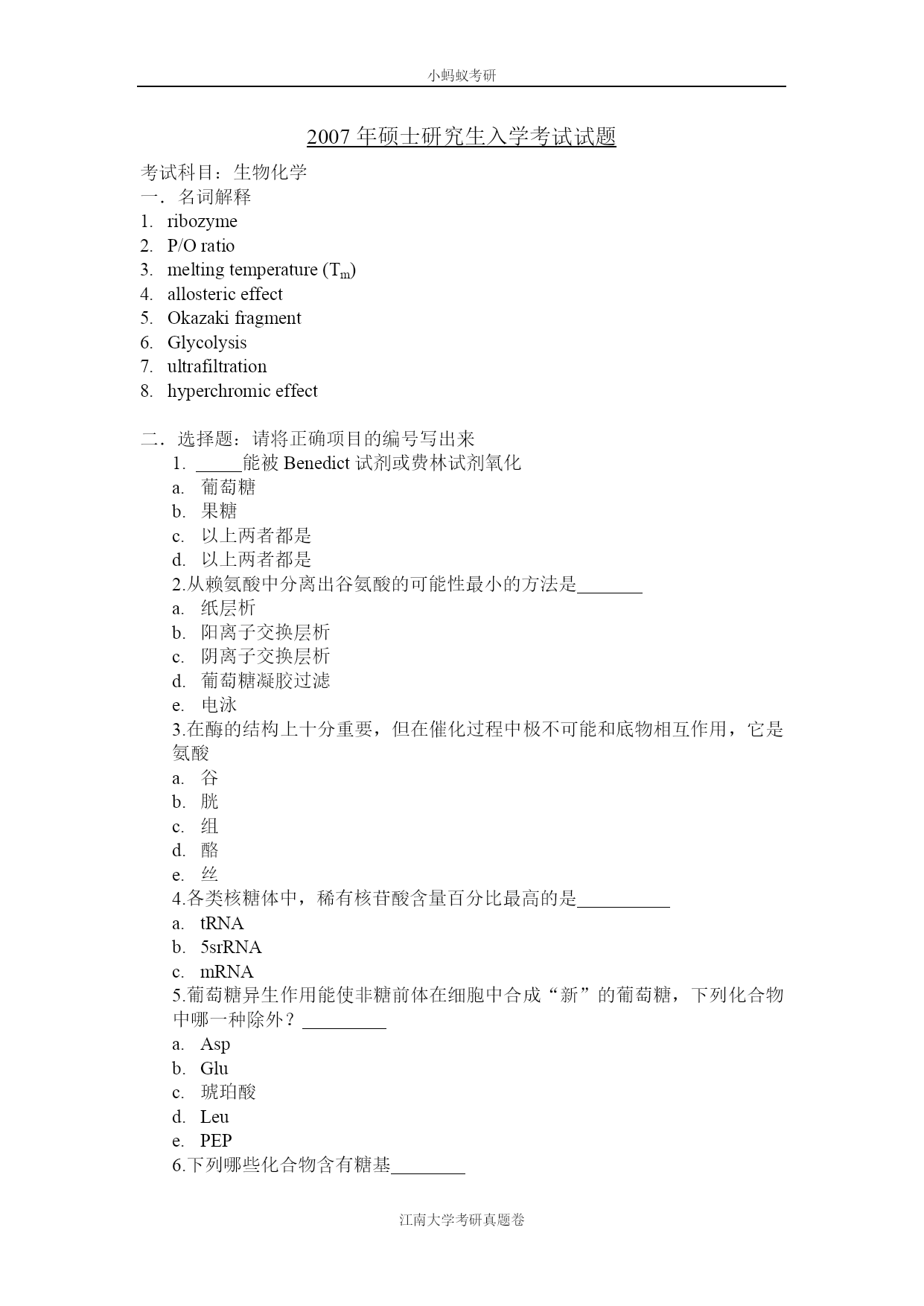 小蚂蚁考研江南大学考研真题卷2007年硕士研究生入学考试试题考试科目:生物化学名词解释ribozymeP/Oratiomeltingtemperature(Tm)allostericeffectOkazakifragmentGlycolysisultrafiltrationhyperchromiceffect选择题:请将正确项目的编号写出来1.能被Benedict试剂或费林试剂氧化葡萄糖果糖以上两者都是以上两者都是2.从赖氨酸中分离出谷氨酸的可能性最小的方法是纸层析阳离子交换层析阴离子交换层析葡萄糖凝胶过
