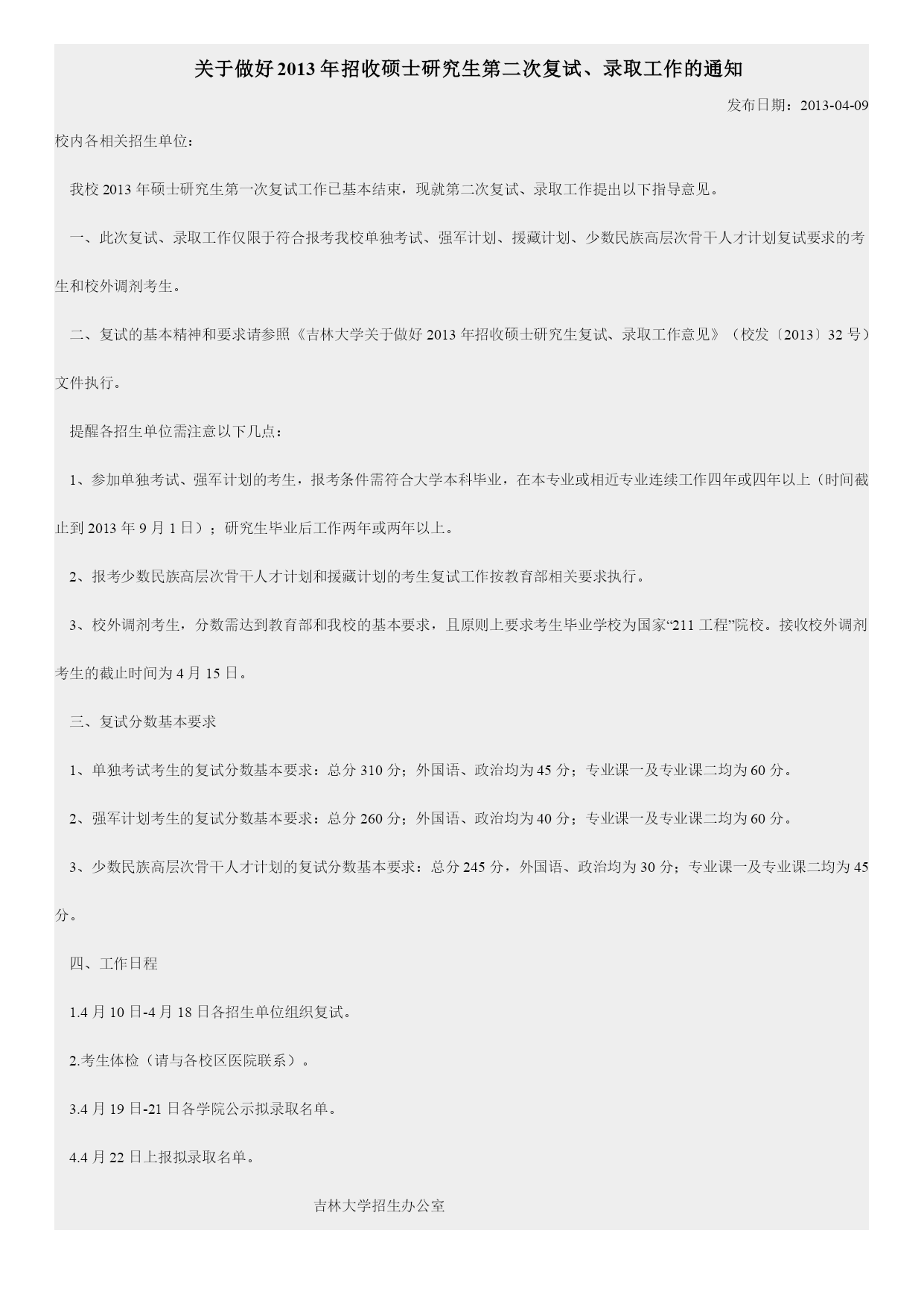 关于做好2013年招收硕士研究生第二次复试、录取工作的通知发布日期:2013-04-09校内各相关招生单位:我校2013年硕士研究生第一次复试工作已基本结束,现就第二次复试、录取工作提出以下指导意见。一、此次复试、录取工作仅限于符合报考我校单独考试、强军计划、援藏计划、少数民族高层次骨干人才计划复试要求的考生和校外调剂考生。二、复试的基本精神和要求请参照《吉林大学关于做好2013年招收硕士研究生复试、录取工作意见》(校发〔2013〕32号)文件执行。提醒各招生单位需注意以下几点:1、参加单独考试、强军计划