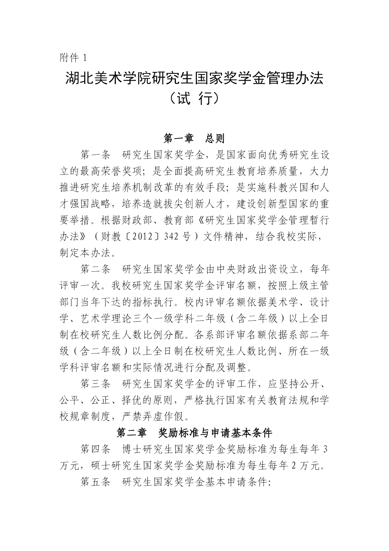附件1湖北美术学院研究生国家奖学金管理办法(试行)第一章总则第一条研究生国家奖学金,是国家面向优秀研究生设立的最高荣誉奖项;是全面提高研究生教育培养质量,大力推进研究生培养机制改革的有效手段;是实施科教兴国和人才强国战略,培养造就拔尖创新人才,建设创新型国家的重要举措。根据财政部、教育部《研究生国家奖学金管理暂行办法》(财教〔2012〕342号)文件精神,结合我校实际,制定本办法。第二条研究生国家奖学金由中央财政出资设立,每年评审一次。我校研究生国家奖学金评审名额,按照上级主管部门当年下达的指标执行。校内