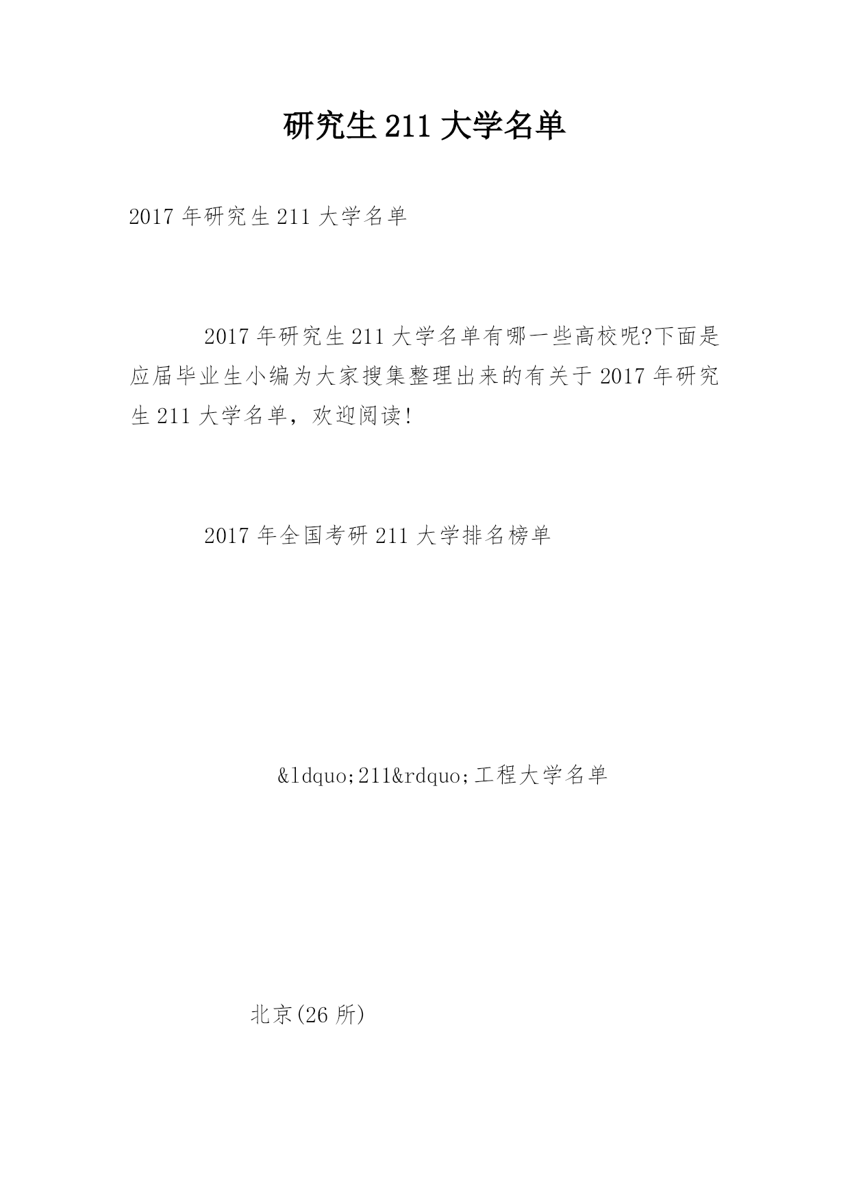 研究生211大学名单2017年研究生211大学名单2017年研究生211大学名单有哪一些高校呢?下面是应届毕业生小编为大家搜集整理出来的有关于2017年研究生211大学名单,欢迎阅读!2017年全国考研211大学排名榜单“211”工程大学名单北京(26所)清华大学北京大学中国人民大学北京工业大学北京理工大学北京航空航天大学北京化工大学北京邮电大学对外经济贸易大学中国传媒大学中央民族大学中国矿业大学(北京)中央财经大学中国政法大学中国石油大学(北京)中央音乐学院北京体育大学北京外国语