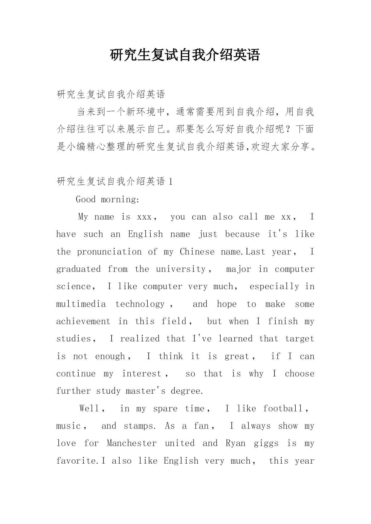 研究生复试自我介绍英语研究生复试自我介绍英语当来到一个新环境中,通常需要用到自我介绍,用自我介绍往往可以来展示自己。那要怎么写好自我介绍呢?下面是小编精心整理的研究生复试自我介绍英语,欢迎大家分享。研究生复试自我介绍英语1Goodmorning:Mynameisxxx,youcanalsocallmexx,IhavesuchanEnglishnamejustbecauseit'slikethepronunciationofmyChinesename.Lastyear,Igraduatedfromtheun