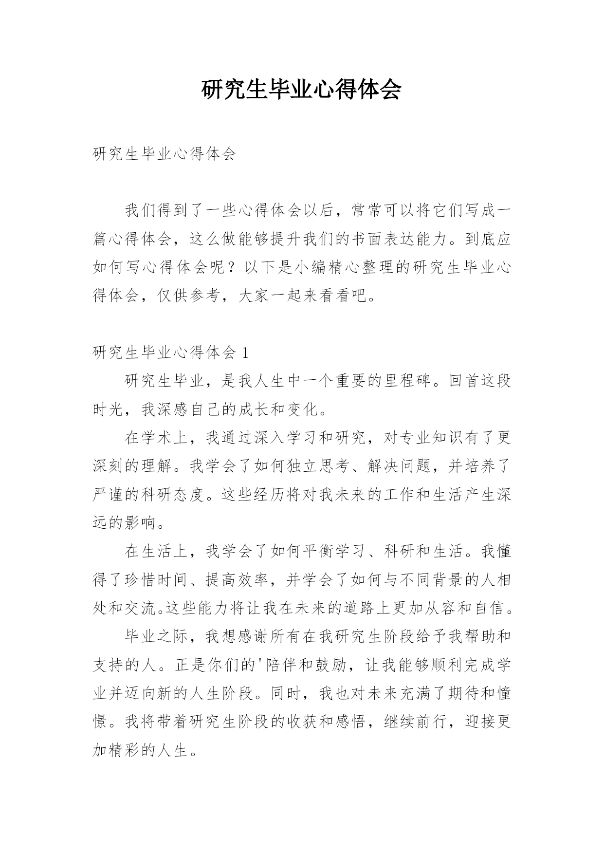 研究生毕业心得体会研究生毕业心得体会我们得到了一些心得体会以后,常常可以将它们写成一篇心得体会,这么做能够提升我们的书面表达能力。到底应如何写心得体会呢?以下是小编精心整理的研究生毕业心得体会,仅供参考,大家一起来看看吧。研究生毕业心得体会1研究生毕业,是我人生中一个重要的里程碑。回首这段时光,我深感自己的成长和变化。在学术上,我通过深入学习和研究,对专业知识有了更深刻的理解。我学会了如何独立思考、解决问题,并培养了严谨的科研态度。这些经历将对我未来的工作和生活产生深远的影响。在生活上,我学会了如何平衡学
