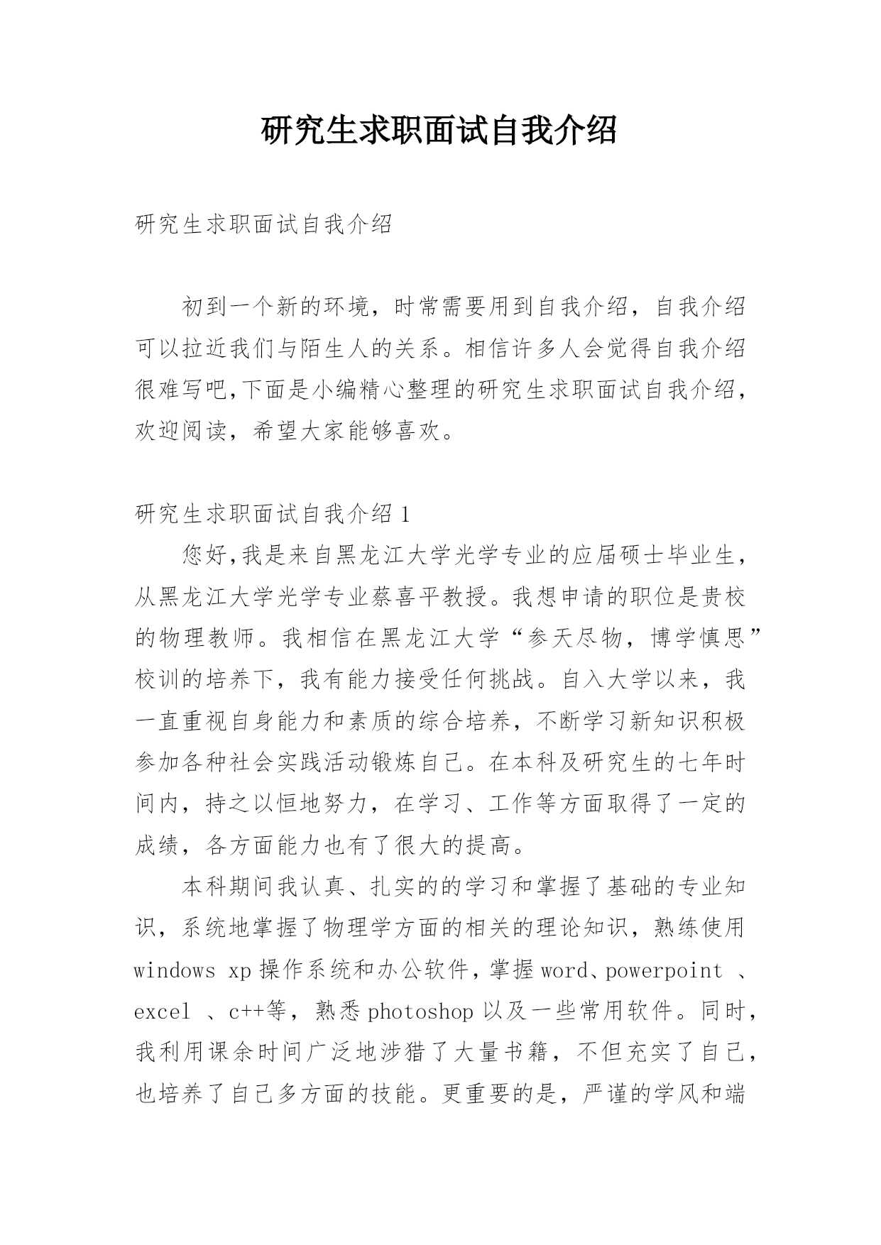 研究生求职面试自我介绍研究生求职面试自我介绍初到一个新的环境,时常需要用到自我介绍,自我介绍可以拉近我们与陌生人的关系。相信许多人会觉得自我介绍很难写吧,下面是小编精心整理的研究生求职面试自我介绍,欢迎阅读,希望大家能够喜欢。研究生求职面试自我介绍1您好,我是来自黑龙江大学光学专业的应届硕士毕业生,从黑龙江大学光学专业蔡喜平教授。我想申请的职位是贵校的物理教师。我相信在黑龙江大学“参天尽物,博学慎思”校训的培养下,我有能力接受任何挑战。自入大学以来,我一直重视自身能力和素质的综合培养,不断学习新知识积极参