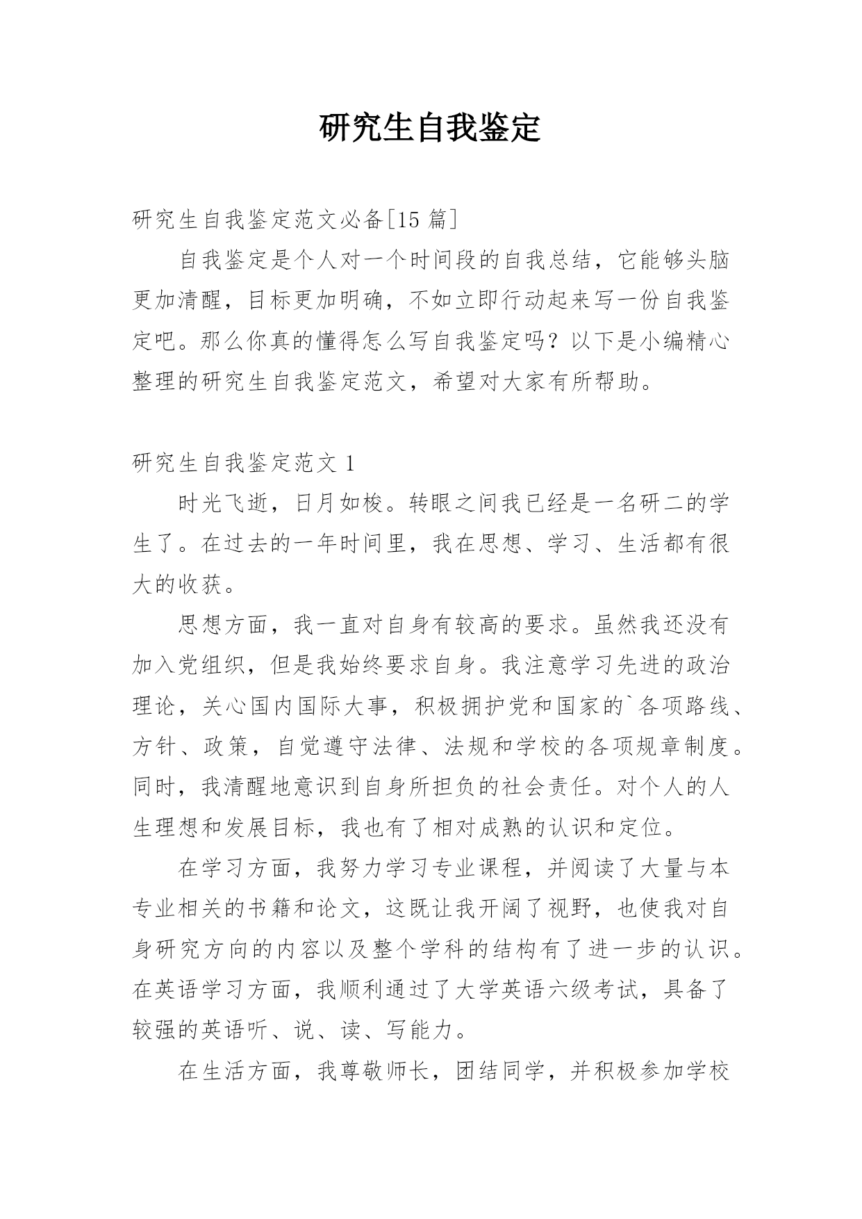 研究生自我鉴定研究生自我鉴定范文必备[15篇]自我鉴定是个人对一个时间段的自我总结,它能够头脑更加清醒,目标更加明确,不如立即行动起来写一份自我鉴定吧。那么你真的懂得怎么写自我鉴定吗?以下是小编精心整理的研究生自我鉴定范文,希望对大家有所帮助。研究生自我鉴定范文1时光飞逝,日月如梭。转眼之间我已经是一名研二的学生了。在过去的一年时间里,我在思想、学习、生活都有很大的收获。思想方面,我一直对自身有较高的要求。虽然我还没有加入党组织,但是我始终要求自身。我注意学习先进的政治理论,关心国内国际大事,积极拥护党和
