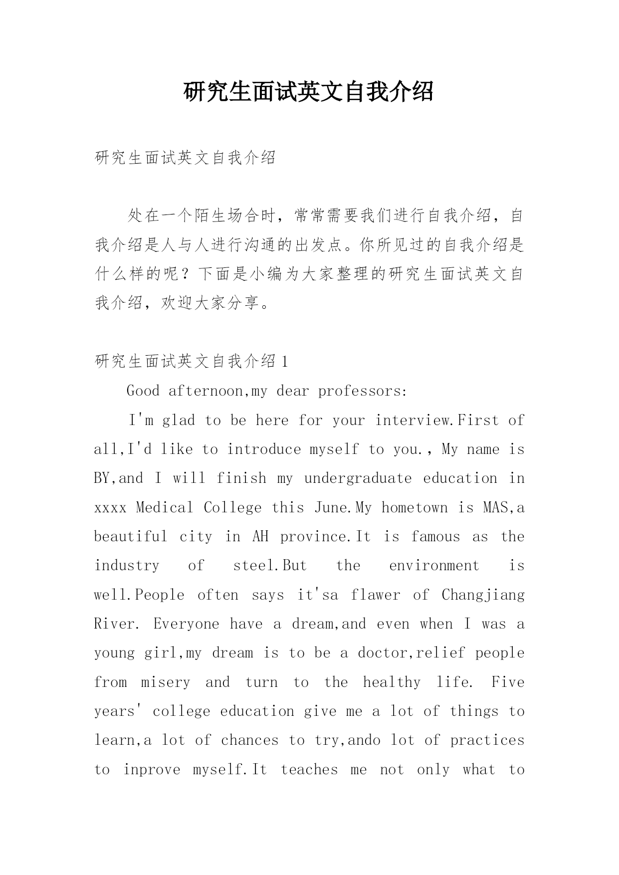 研究生面试英文自我介绍研究生面试英文自我介绍处在一个陌生场合时,常常需要我们进行自我介绍,自我介绍是人与人进行沟通的出发点。你所见过的自我介绍是什么样的呢?下面是小编为大家整理的研究生面试英文自我介绍,欢迎大家分享。研究生面试英文自我介绍1Goodafternoon,mydearprofessors:I'mgladtobehereforyourinterview.Firstofall,I'dliketointroducemyselftoyou.,MynameisBY,andIwillfinishmyund