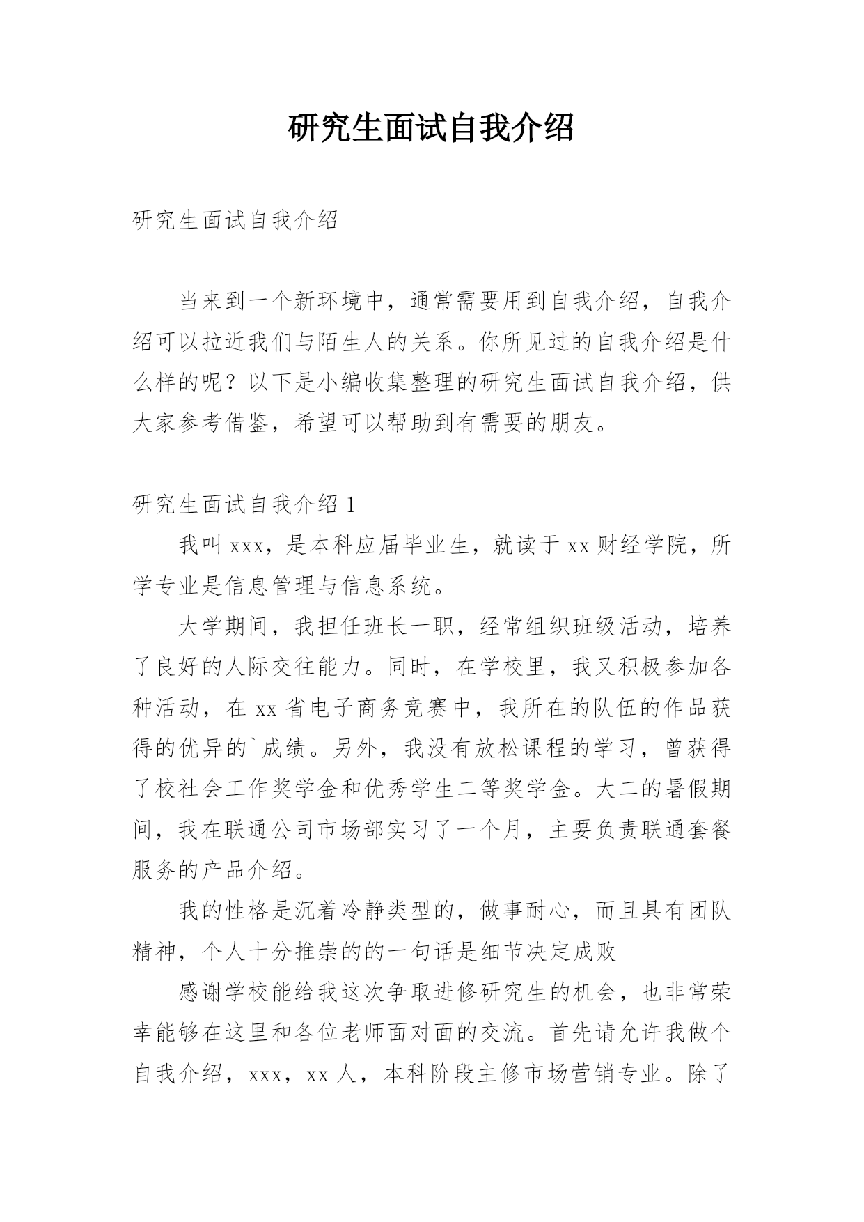 研究生面试自我介绍研究生面试自我介绍当来到一个新环境中,通常需要用到自我介绍,自我介绍可以拉近我们与陌生人的关系。你所见过的自我介绍是什么样的呢?以下是小编收集整理的研究生面试自我介绍,供大家参考借鉴,希望可以帮助到有需要的朋友。研究生面试自我介绍1我叫xxx,是本科应届毕业生,就读于xx财经学院,所学专业是信息管理与信息系统。大学期间,我担任班长一职,经常组织班级活动,培养了良好的人际交往能力。同时,在学校里,我又积极参加各种活动,在xx省电子商务竞赛中,我所在的队伍的作品获得的优异的`成绩。另外,我没