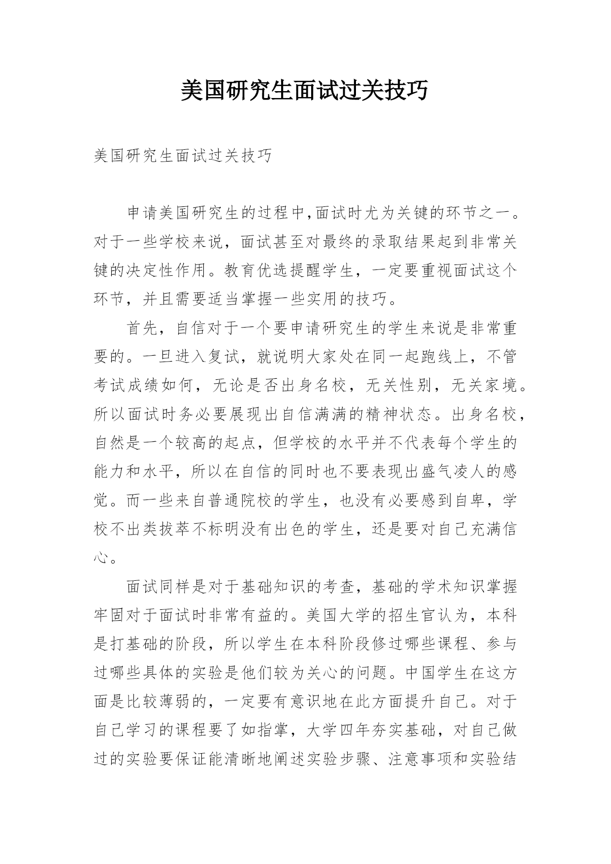 美国研究生面试过关技巧美国研究生面试过关技巧申请美国研究生的过程中,面试时尤为关键的环节之一。对于一些学校来说,面试甚至对最终的录取结果起到非常关键的决定性作用。教育优选提醒学生,一定要重视面试这个环节,并且需要适当掌握一些实用的技巧。首先,自信对于一个要申请研究生的学生来说是非常重要的。一旦进入复试,就说明大家处在同一起跑线上,不管考试成绩如何,无论是否出身名校,无关性别,无关家境。所以面试时务必要展现出自信满满的精神状态。出身名校,自然是一个较高的起点,但学校的水平并不代表每个学生的能力和水平,所以在