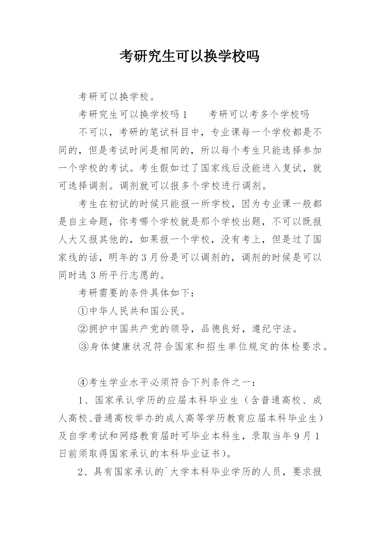 考研究生可以换学校吗考研可以换学校。考研究生可以换学校吗1考研可以考多个学校吗不可以,考研的笔试科目中,专业课每一个学校都是不同的,但是考试时间是相同的,所以每个考生只能选择参加一个学校的考试。考生假如过了国家线后没能进入复试,就可选择调剂。调剂就可以报多个学校进行调剂。考生在初试的时候只能报一所学校,因为专业课一般都是自主命题,你考哪个学校就是那个学校出题,不可以既报人大又报其他的,如果报一个学校,没有考上,但是过了国家线的话,明年的3月份是可以调剂的,调剂的时候是可以同时选3所平行志愿的。考研需要的条