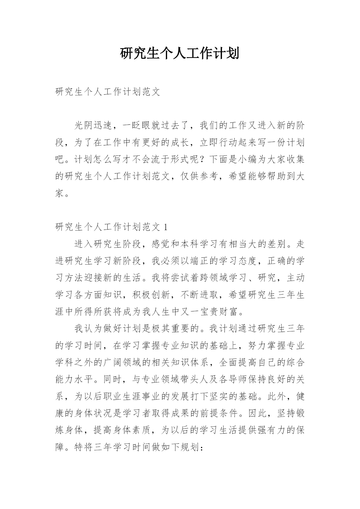 研究生个人工作计划研究生个人工作计划范文光阴迅速,一眨眼就过去了,我们的工作又进入新的阶段,为了在工作中有更好的成长,立即行动起来写一份计划吧。计划怎么写才不会流于形式呢?下面是小编为大家收集的研究生个人工作计划范文,仅供参考,希望能够帮助到大家。研究生个人工作计划范文1进入研究生阶段,感觉和本科学习有相当大的差别。走进研究生学习新阶段,我必须以端正的学习态度,正确的学习方法迎接新的生活。我将尝试着跨领域学习、研究,主动学习各方面知识,积极创新,不断进取,希望研究生三年生涯中所得所获将成为我人生中又一宝贵