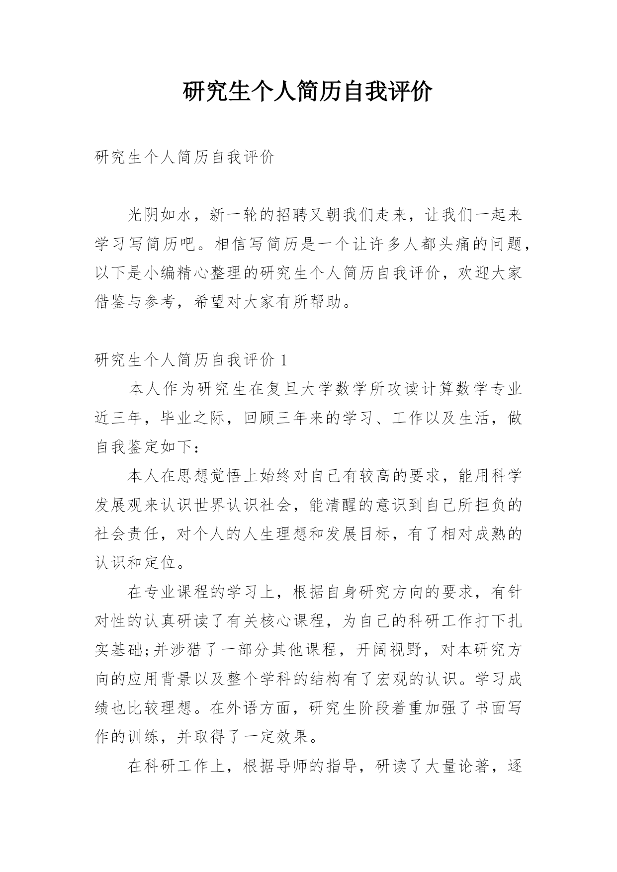 研究生个人简历自我评价研究生个人简历自我评价光阴如水,新一轮的招聘又朝我们走来,让我们一起来学习写简历吧。相信写简历是一个让许多人都头痛的问题,以下是小编精心整理的研究生个人简历自我评价,欢迎大家借鉴与参考,希望对大家有所帮助。研究生个人简历自我评价1本人作为研究生在复旦大学数学所攻读计算数学专业近三年,毕业之际,回顾三年来的学习、工作以及生活,做自我鉴定如下:本人在思想觉悟上始终对自己有较高的要求,能用科学发展观来认识世界认识社会,能清醒的意识到自己所担负的社会责任,对个人的人生理想和发展目标,有了相对