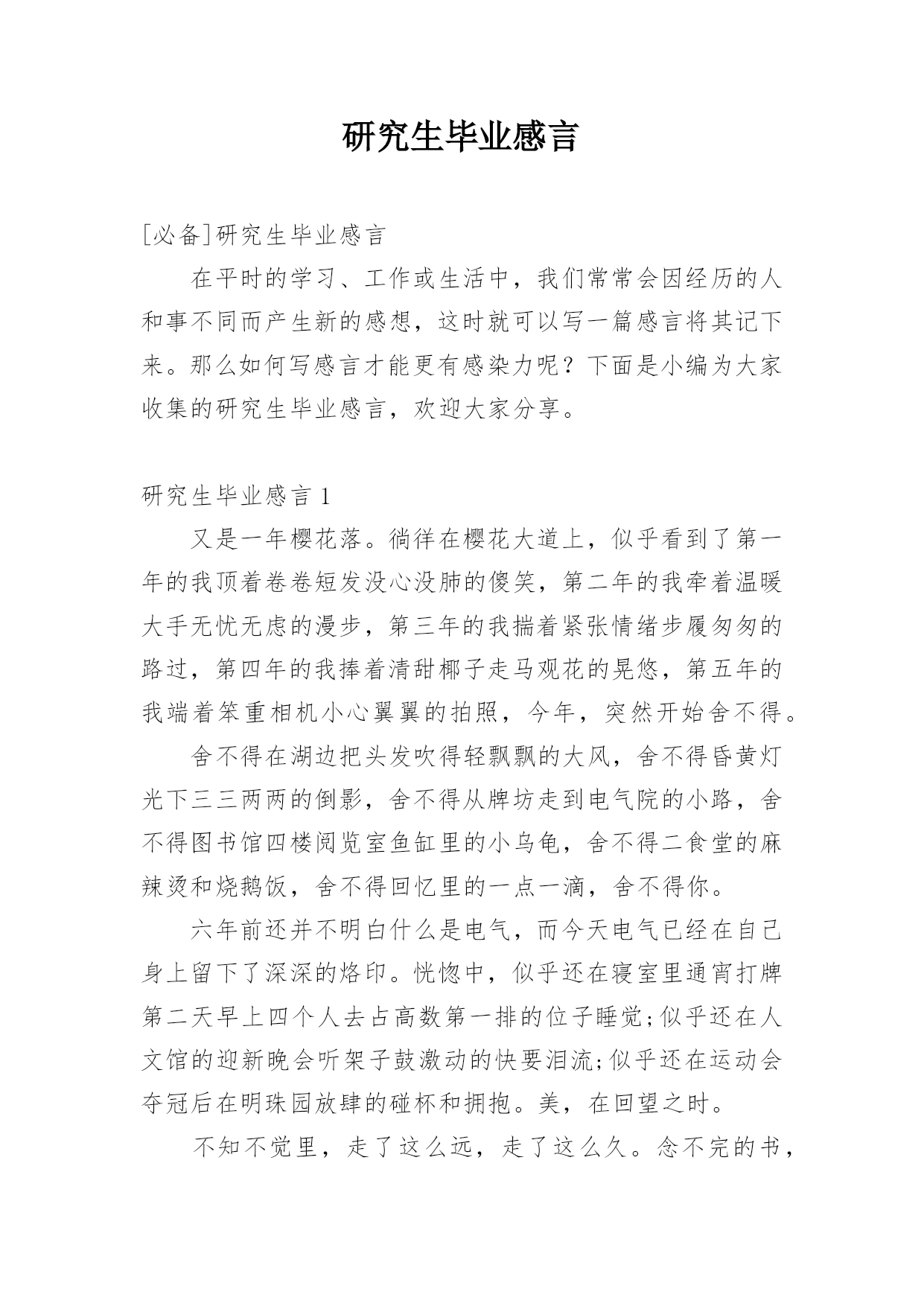 研究生毕业感言[必备]研究生毕业感言在平时的学习、工作或生活中,我们常常会因经历的人和事不同而产生新的感想,这时就可以写一篇感言将其记下来。那么如何写感言才能更有感染力呢?下面是小编为大家收集的研究生毕业感言,欢迎大家分享。研究生毕业感言1又是一年樱花落。徜徉在樱花大道上,似乎看到了第一年的我顶着卷卷短发没心没肺的傻笑,第二年的我牵着温暖大手无忧无虑的漫步,第三年的我揣着紧张情绪步履匆匆的路过,第四年的我捧着清甜椰子走马观花的晃悠,第五年的我端着笨重相机小心翼翼的拍照,今年,突然开始舍不得。舍不得在湖边把