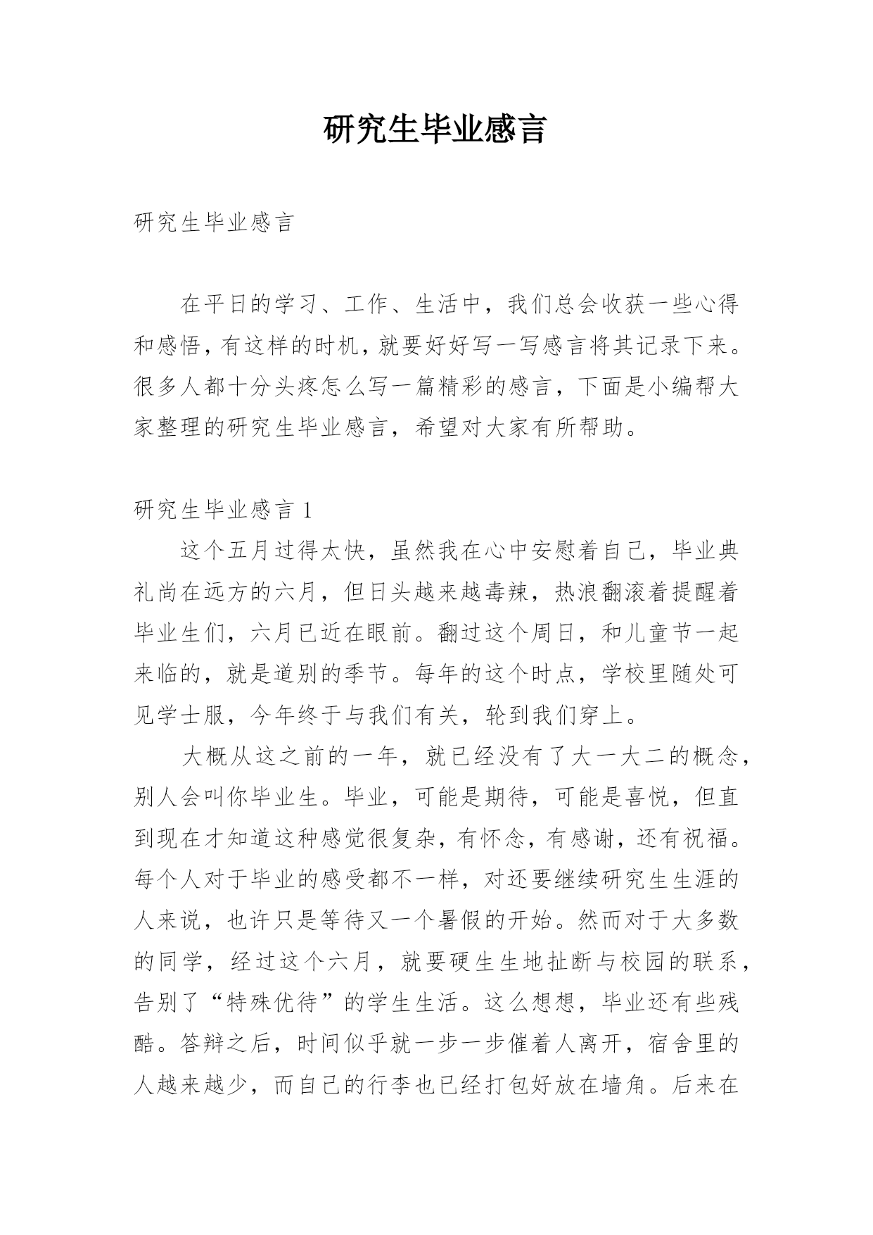 研究生毕业感言研究生毕业感言在平日的学习、工作、生活中,我们总会收获一些心得和感悟,有这样的时机,就要好好写一写感言将其记录下来。很多人都十分头疼怎么写一篇精彩的感言,下面是小编帮大家整理的研究生毕业感言,希望对大家有所帮助。研究生毕业感言1这个五月过得太快,虽然我在心中安慰着自己,毕业典礼尚在远方的六月,但日头越来越毒辣,热浪翻滚着提醒着毕业生们,六月已近在眼前。翻过这个周日,和儿童节一起来临的,就是道别的季节。每年的这个时点,学校里随处可见学士服,今年终于与我们有关,轮到我们穿上。大概从这之前的一年,