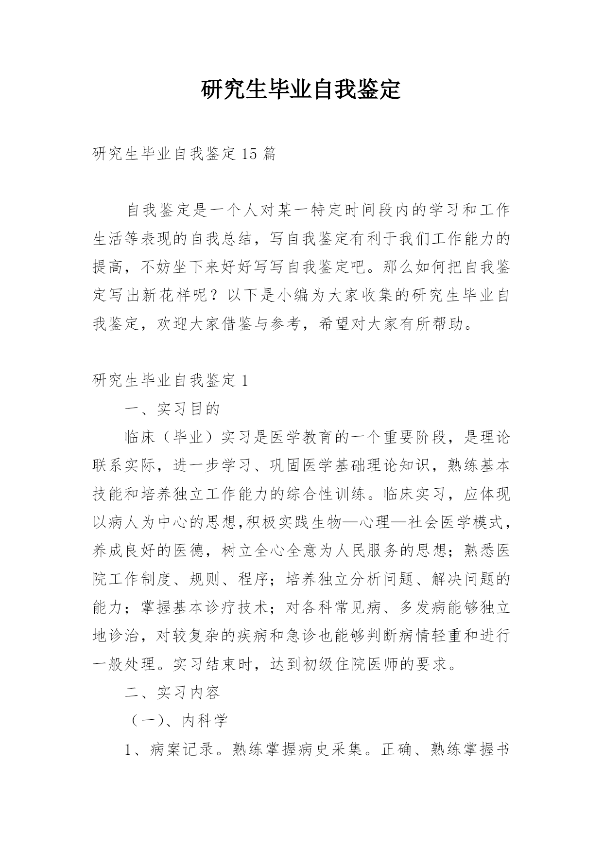 研究生毕业自我鉴定研究生毕业自我鉴定15篇自我鉴定是一个人对某一特定时间段内的学习和工作生活等表现的自我总结,写自我鉴定有利于我们工作能力的提高,不妨坐下来好好写写自我鉴定吧。那么如何把自我鉴定写出新花样呢?以下是小编为大家收集的研究生毕业自我鉴定,欢迎大家借鉴与参考,希望对大家有所帮助。研究生毕业自我鉴定1一、实习目的临床(毕业)实习是医学教育的一个重要阶段,是理论联系实际,进一步学习、巩固医学基础理论知识,熟练基本技能和培养独立工作能力的综合性训练。临床实习,应体现以病人为中心的思想,积极实践生物—心